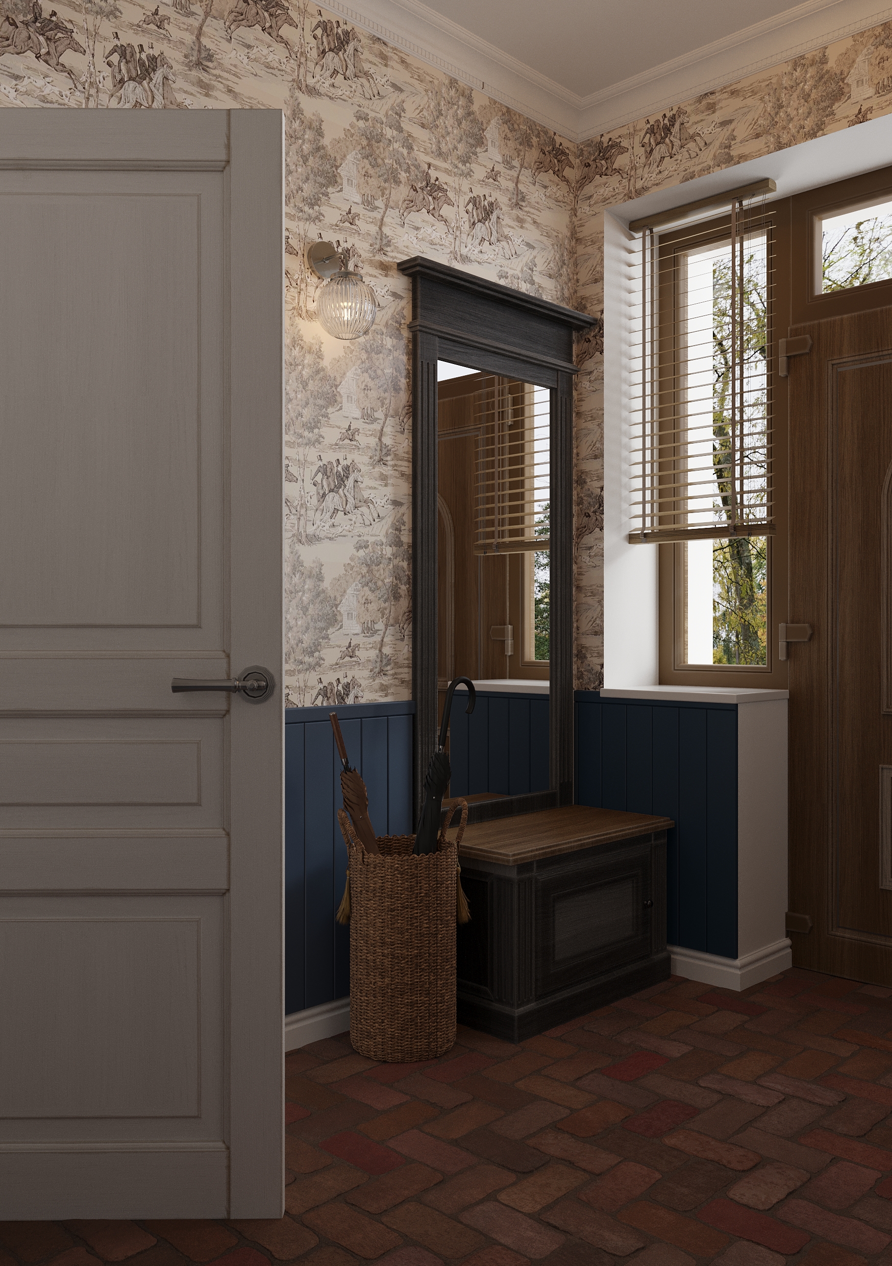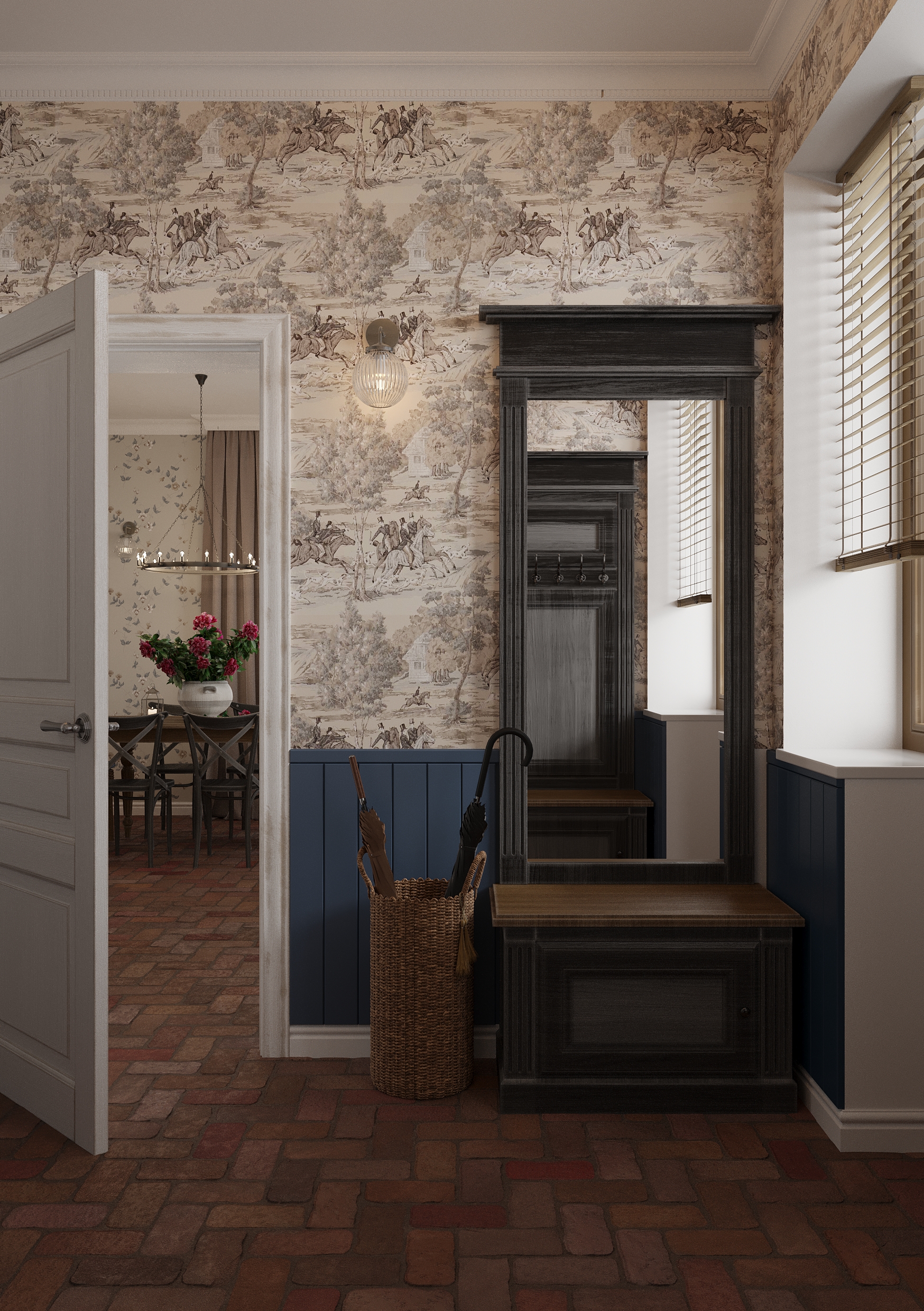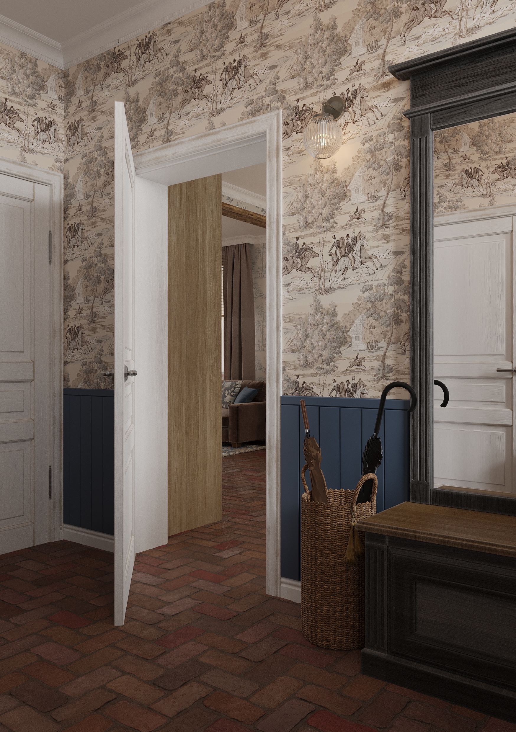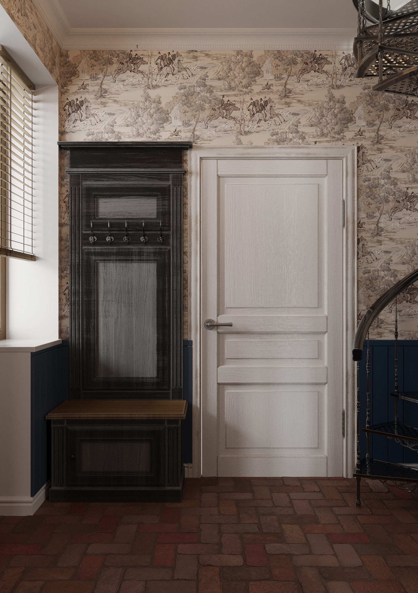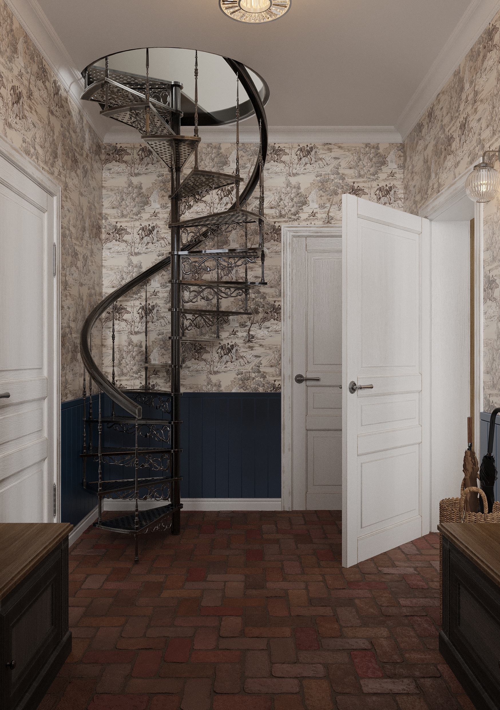 Już od progu uwagę przyciąga prawdziwa, stara cegła położona na podłodze, która nadaje przestrzeni charakter i przytulność. W przedpokoju zaprojektowano mosiężne, kute schody wykonane na zamówienie – prowadzą one na użytkowe poddasze i stanowią nie tylko funkcjonalny element domu, ale też dekoracyjny, rzeźbiarski akcent.