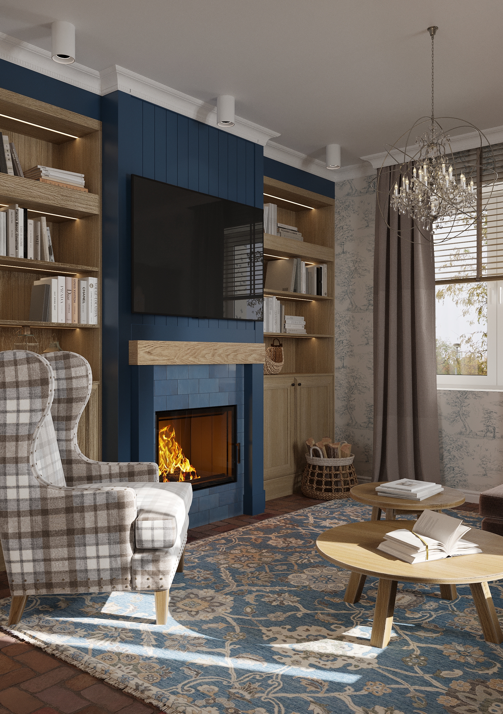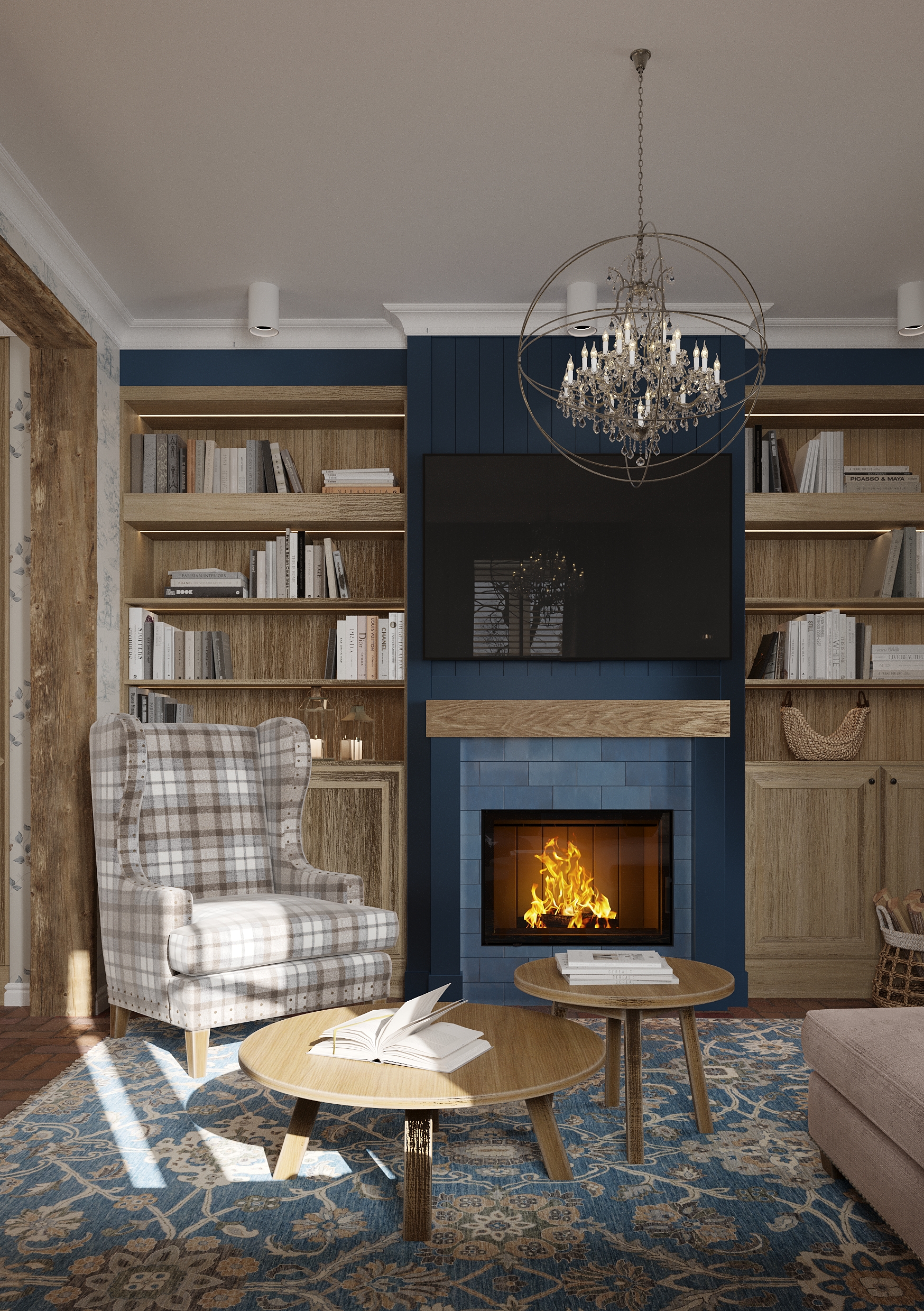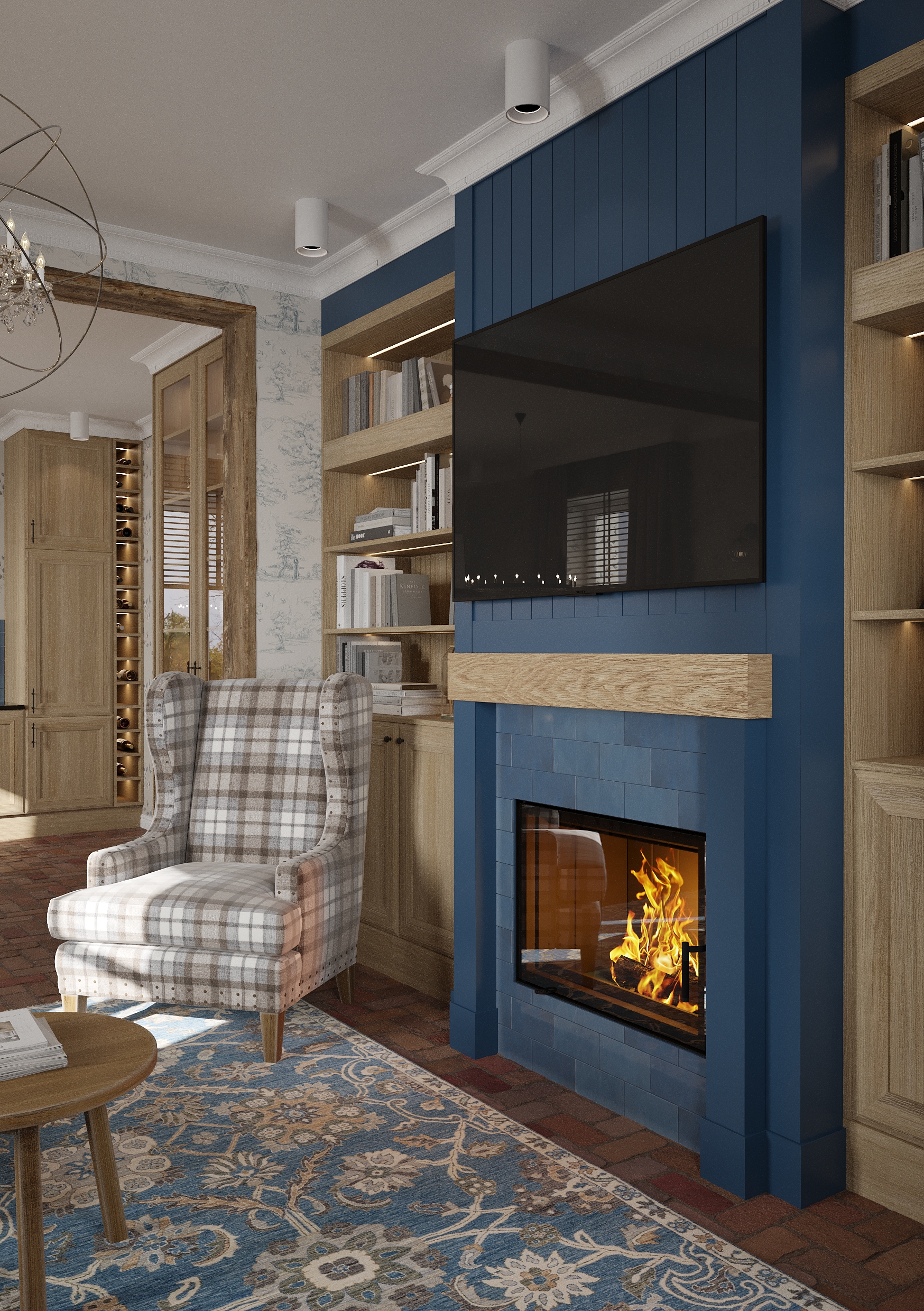 Sercem wnętrza jest salon z kominkiem, który stanowi naturalny punkt centralny strefy dziennej. Otwarta przestrzeń została urządzona w duchu nowoczesnej interpretacji stylu rustykalnego – z ciepłymi materiałami, naturalnym światłem i starannie dobranymi detalami. Całość emanuje spokojem, autentycznością i domowym ciepłem.