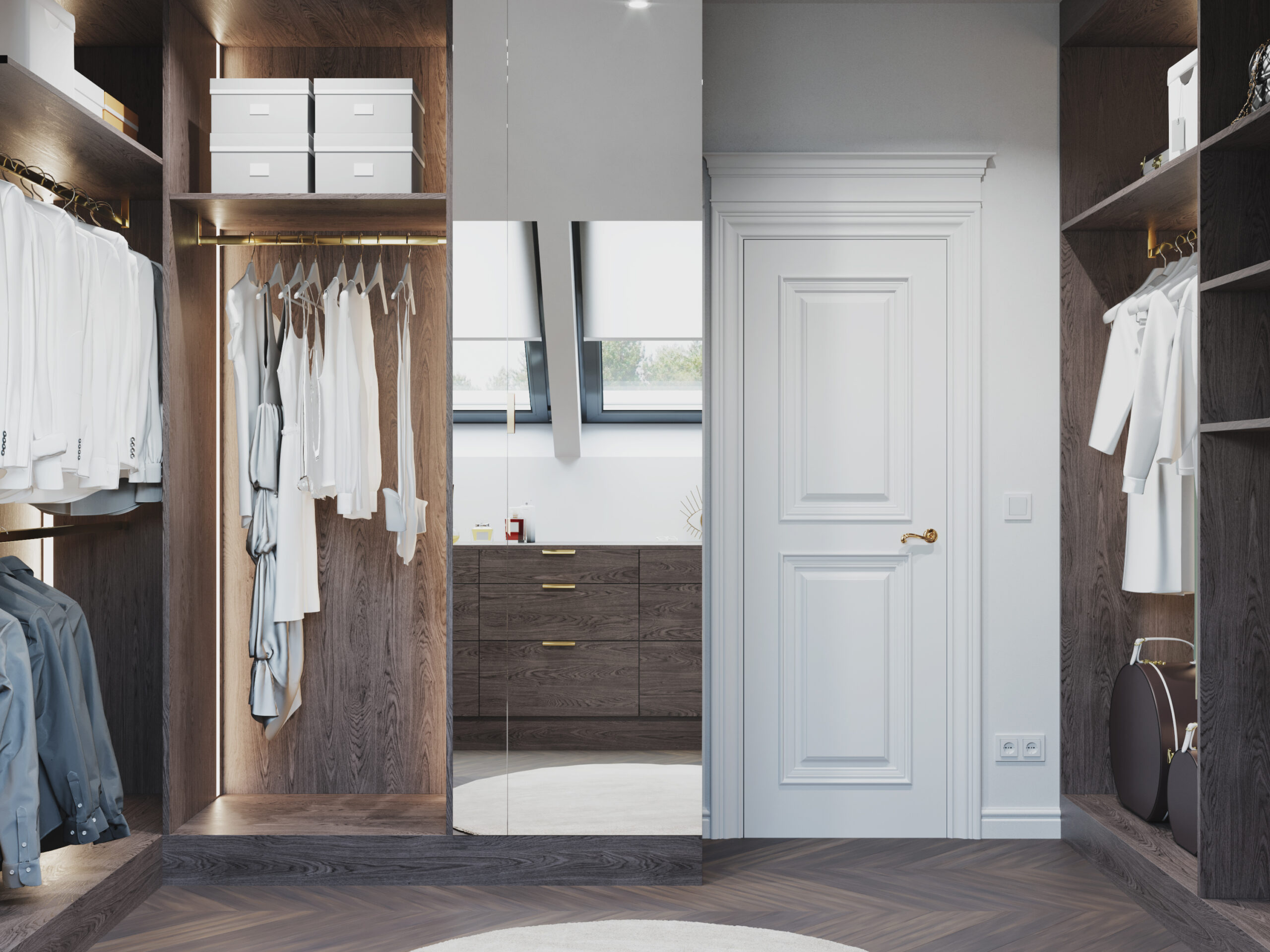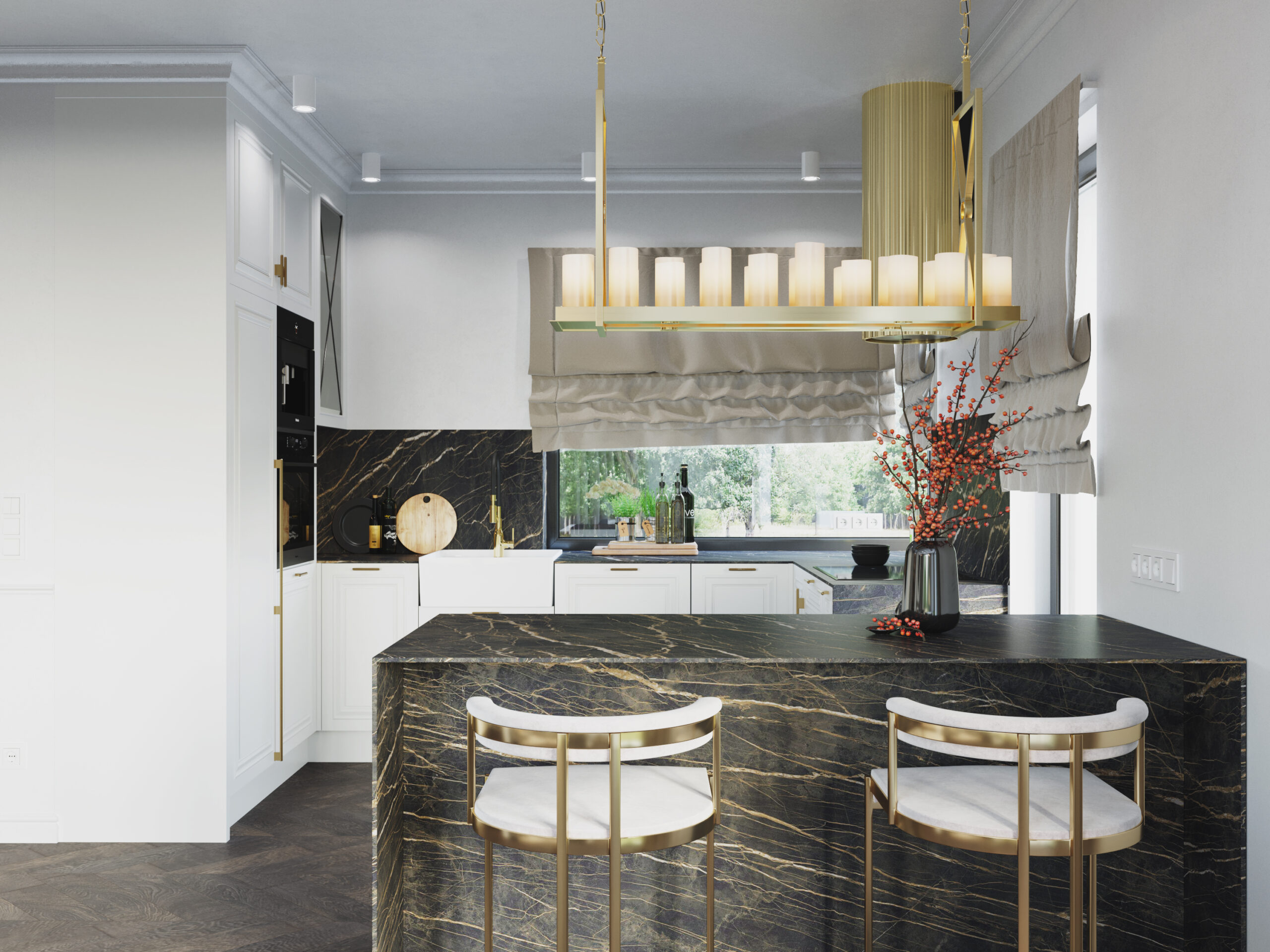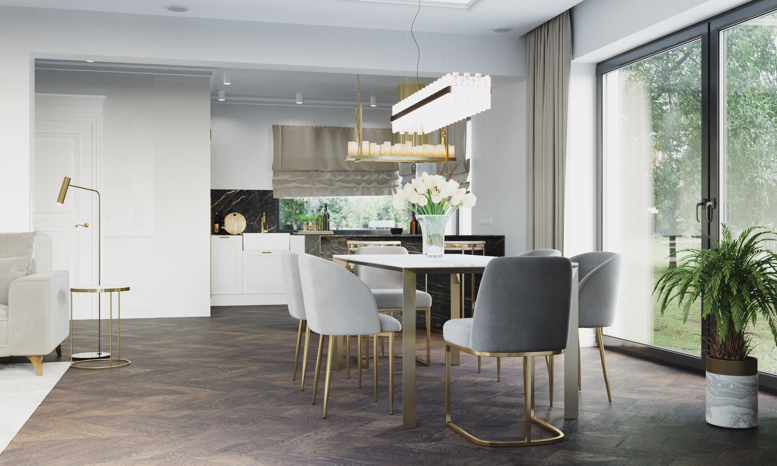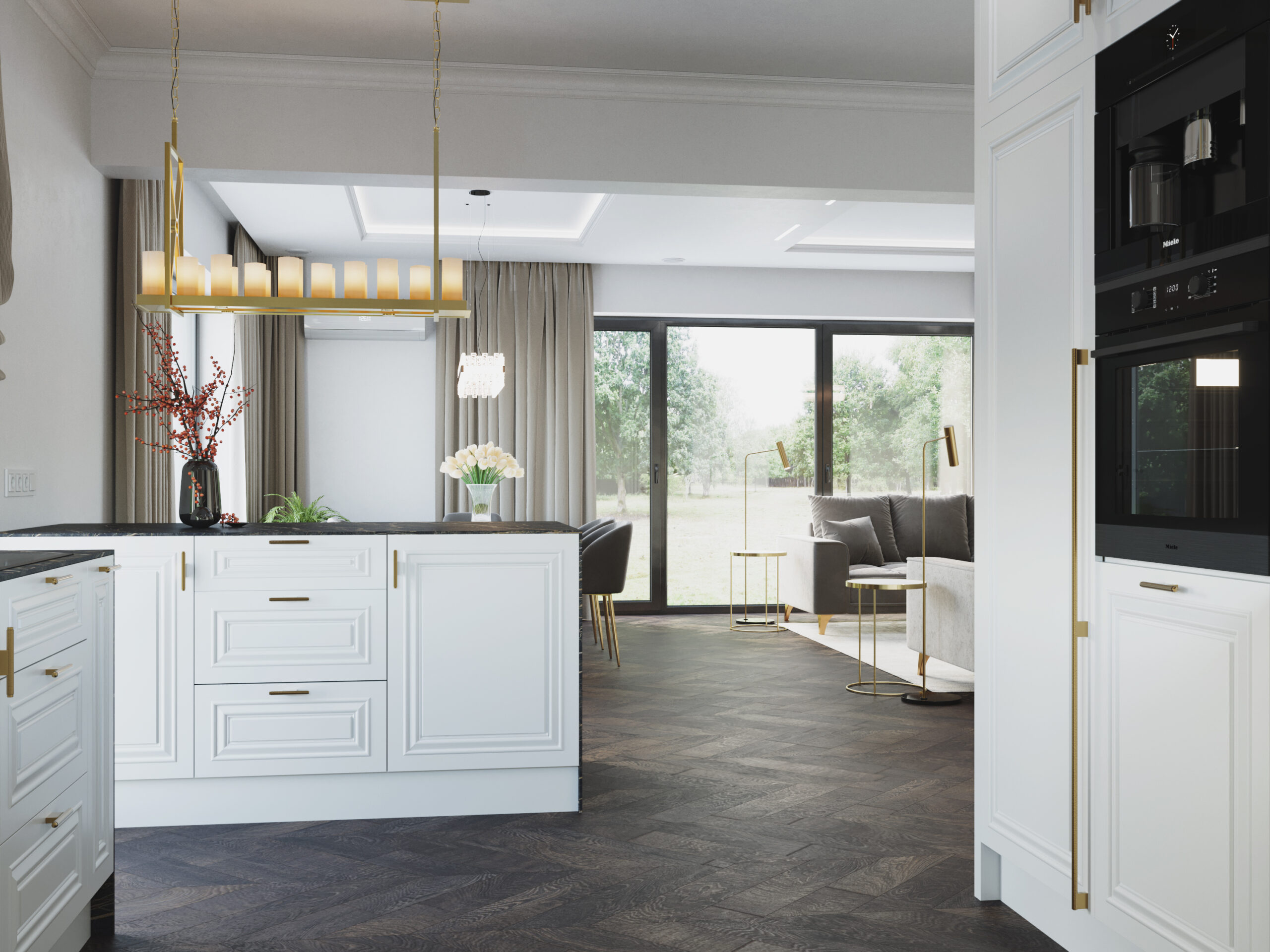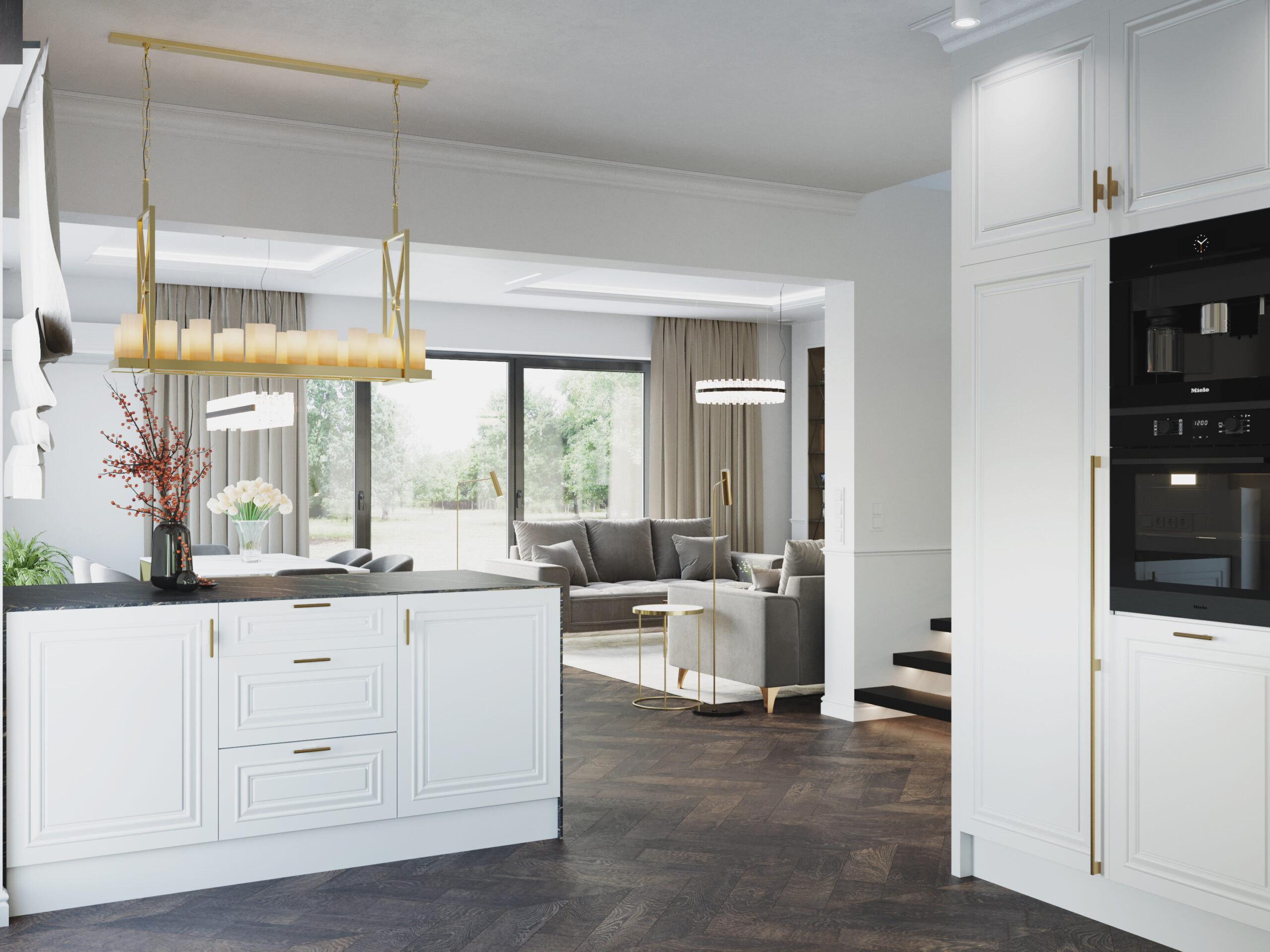 We wnętrzach królują złote akcenty, które nadają przestrzeni subtelnego blasku i luksusowego charakteru. Naturalny kamień podkreśla szlachetność aranżacji, a drewniana podłoga w jodełkę wprowadza rytm, ciepło i ponadczasową elegancję. Kontrast stanowi biała klasyczna stolarka drzwiowa oraz białe meble, które rozświetlają przestrzeń i sprawiają, że całość zyskuje lekkość oraz harmonię.