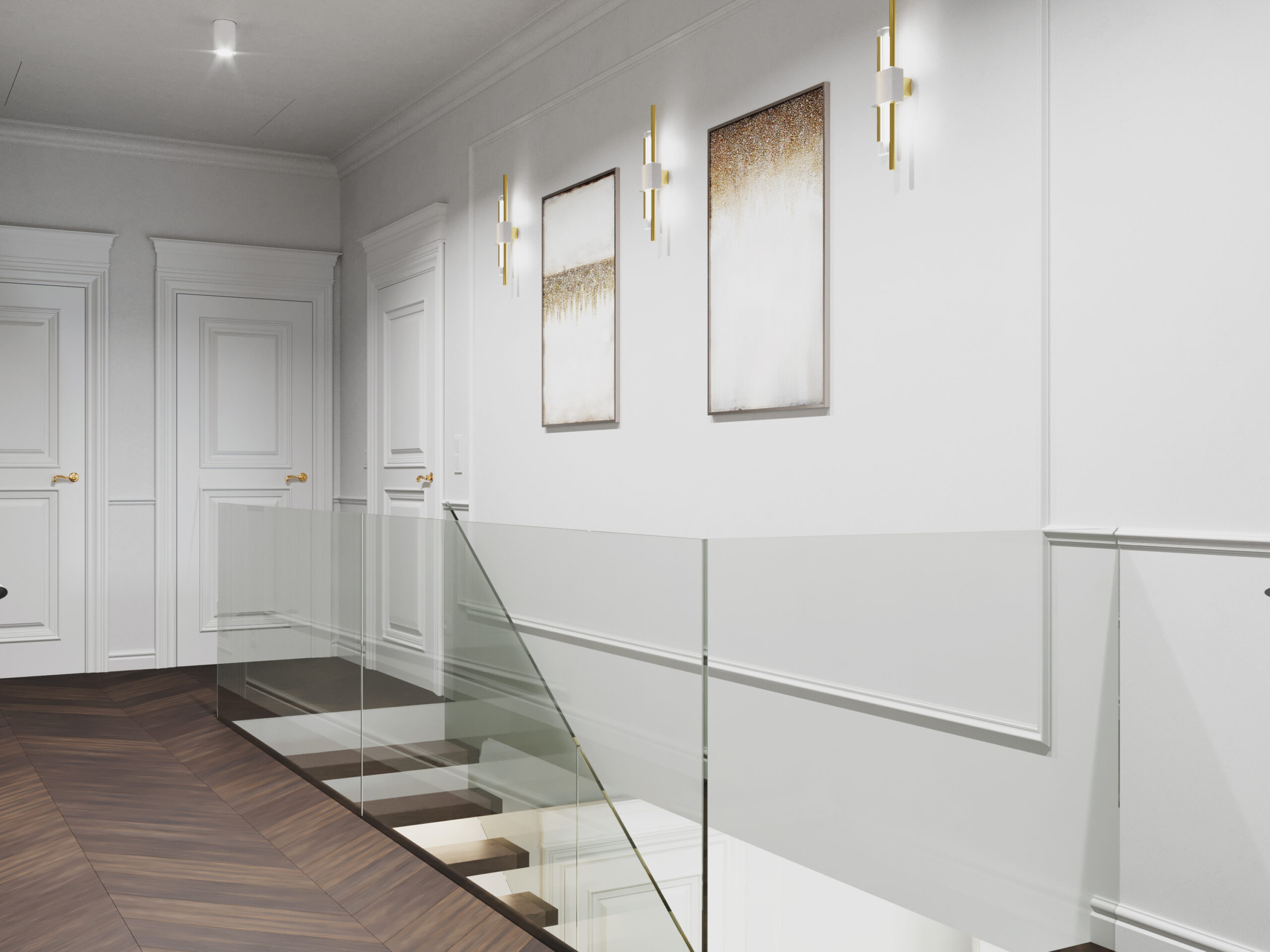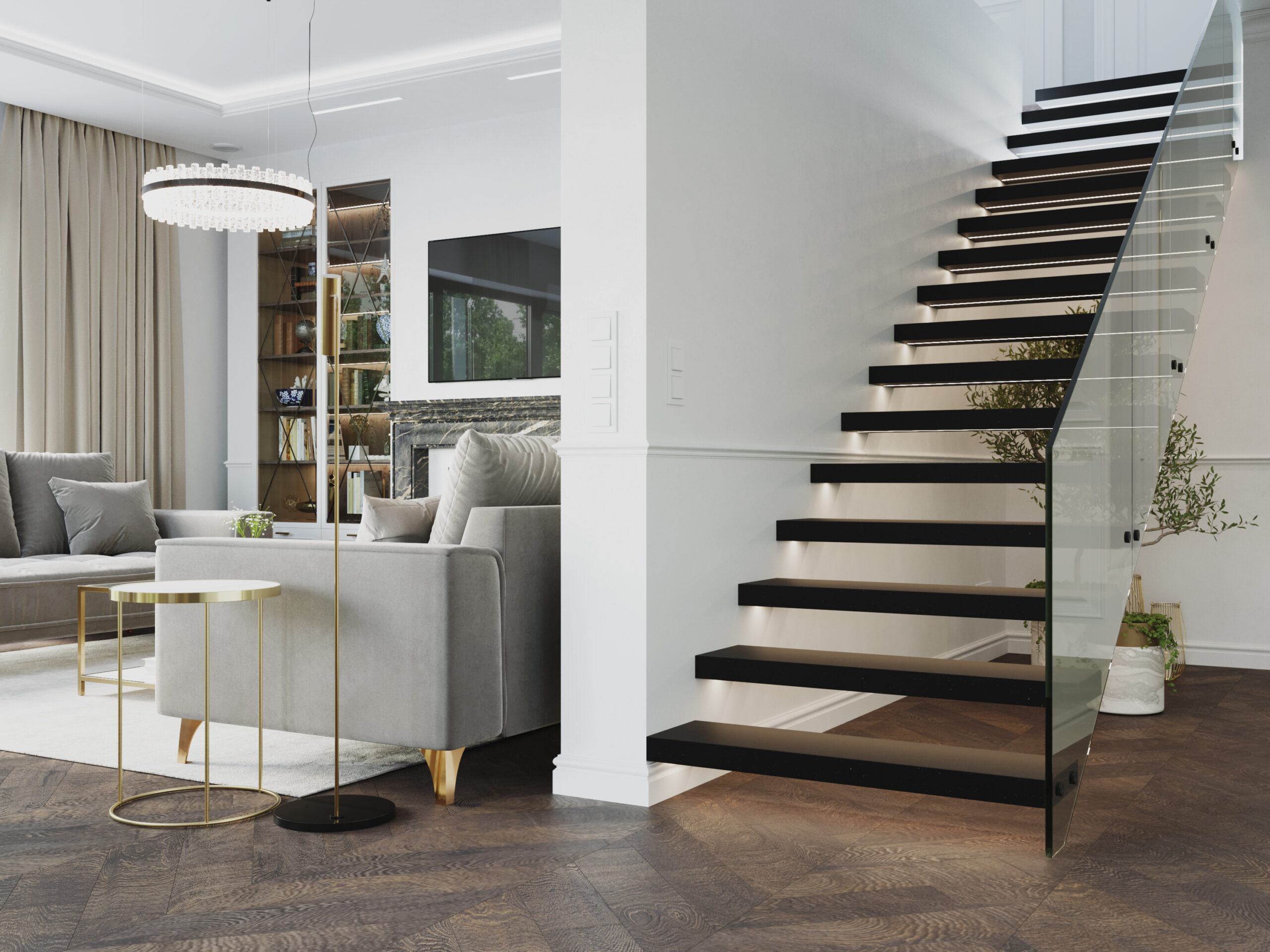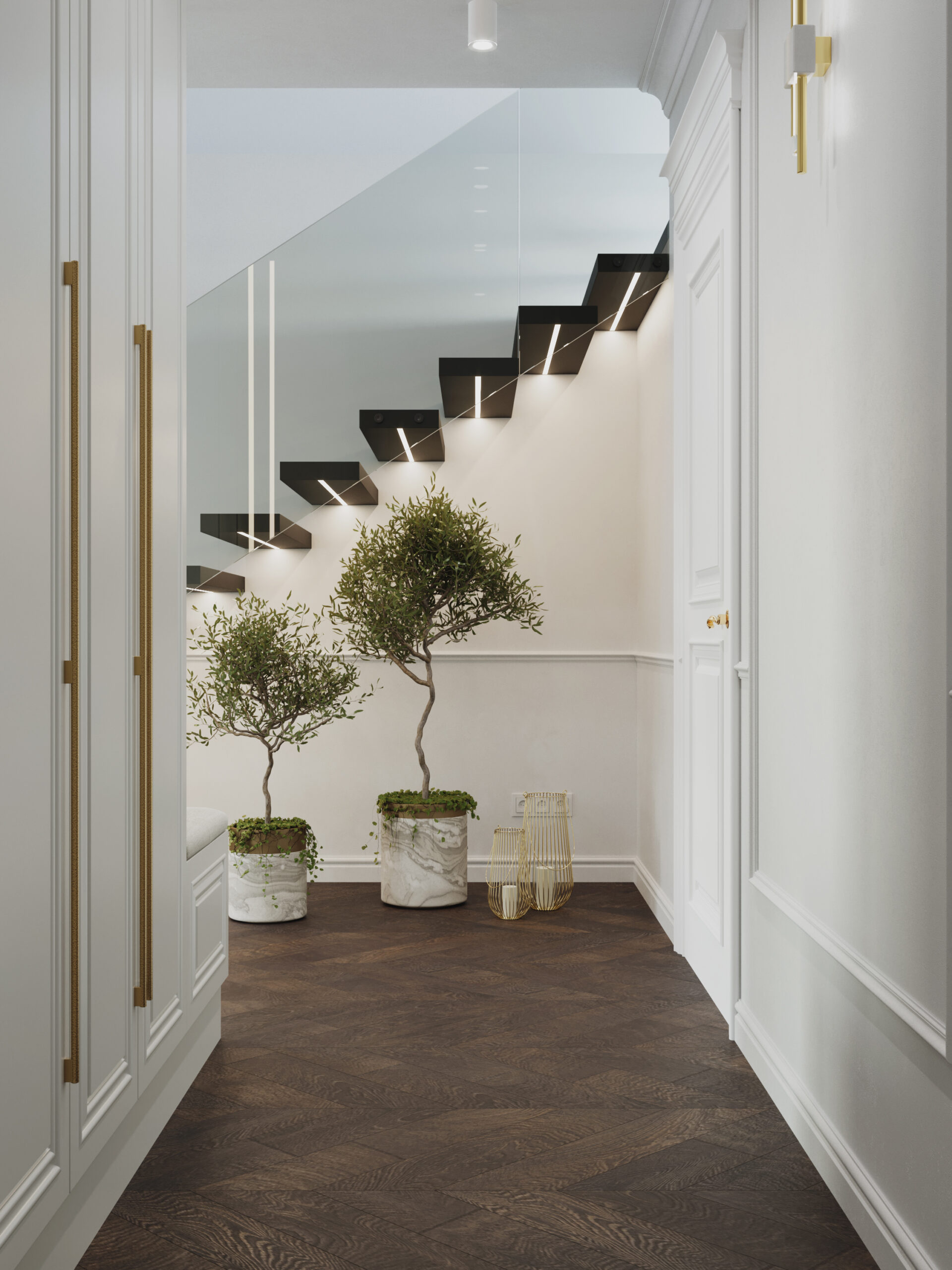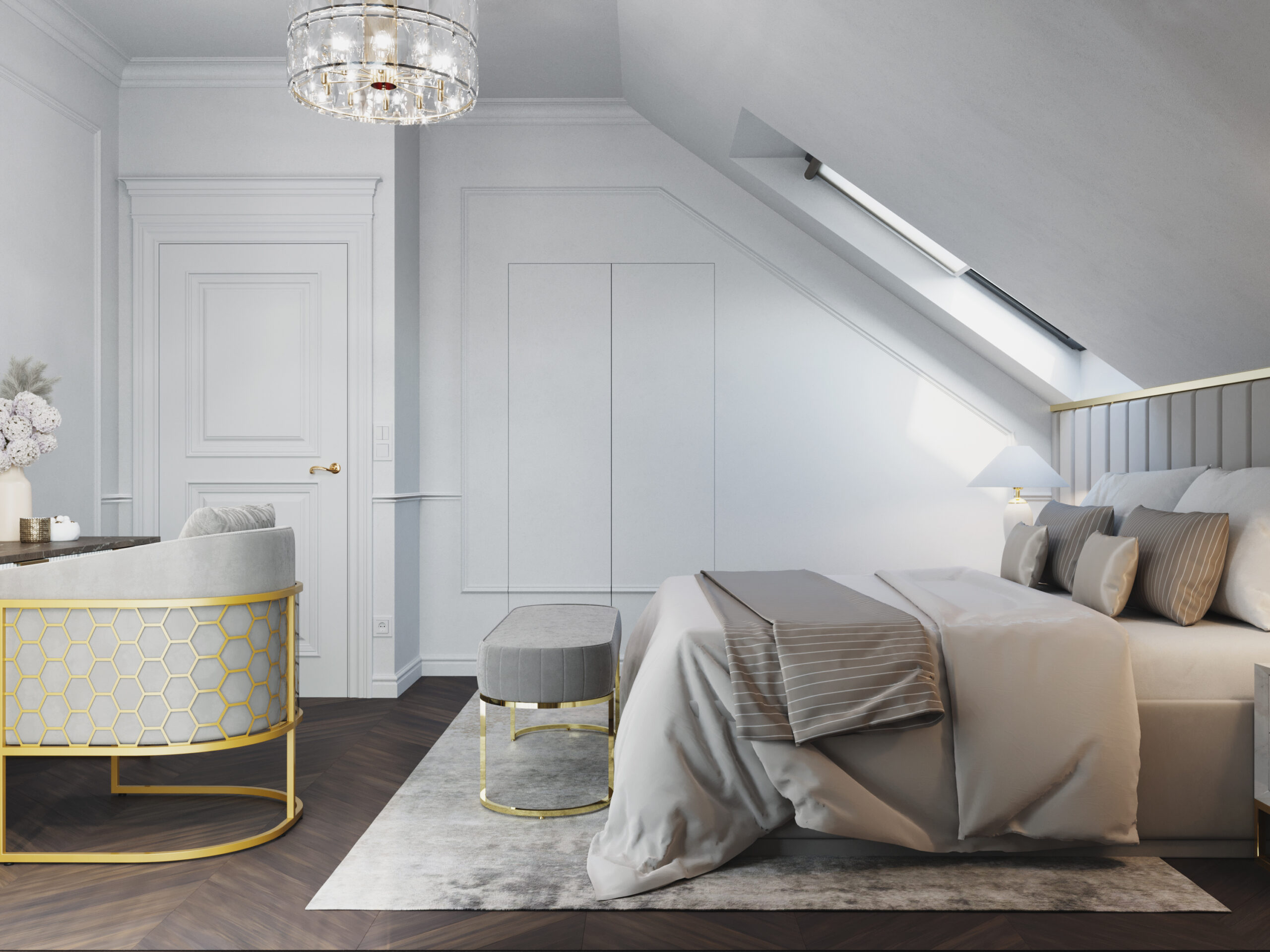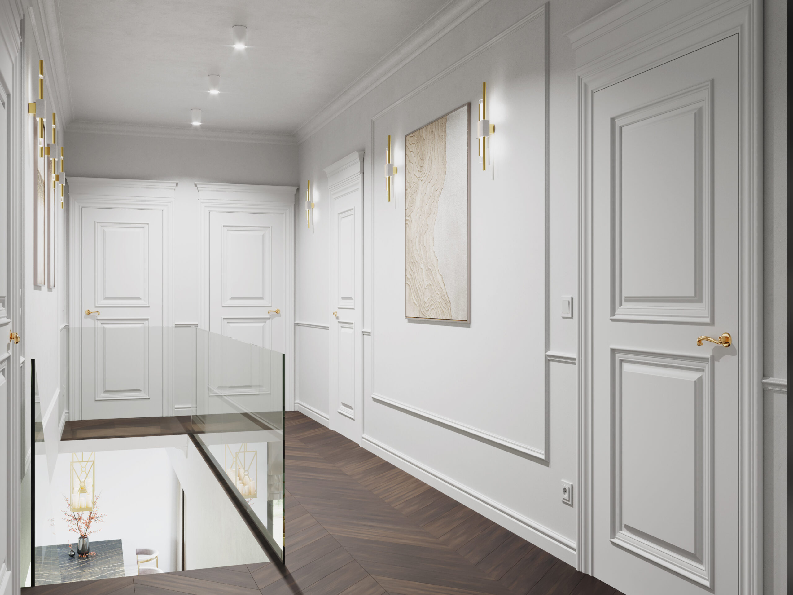 We wnętrzach królują złote akcenty, które nadają przestrzeni subtelnego blasku i luksusowego charakteru. Naturalny kamień podkreśla szlachetność aranżacji, a drewniana podłoga w jodełkę wprowadza rytm, ciepło i ponadczasową elegancję. Kontrast stanowi biała klasyczna stolarka drzwiowa oraz białe meble, które rozświetlają przestrzeń i sprawiają, że całość zyskuje lekkość oraz harmonię.
