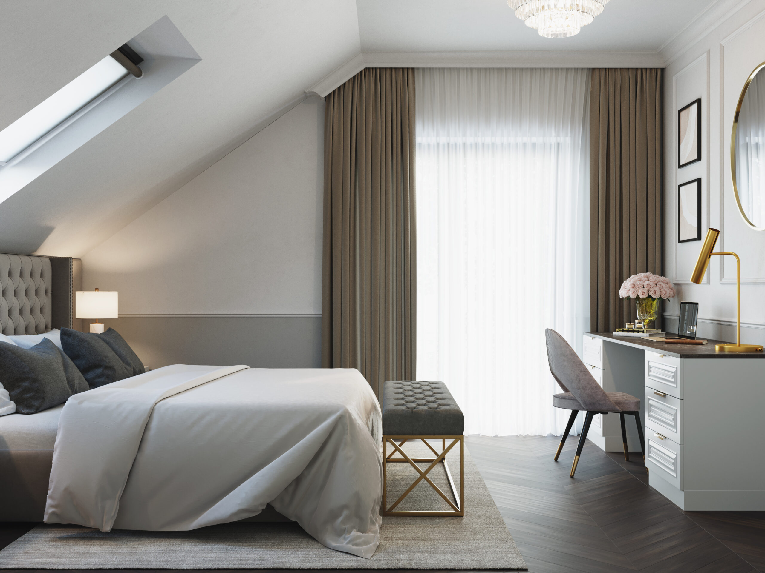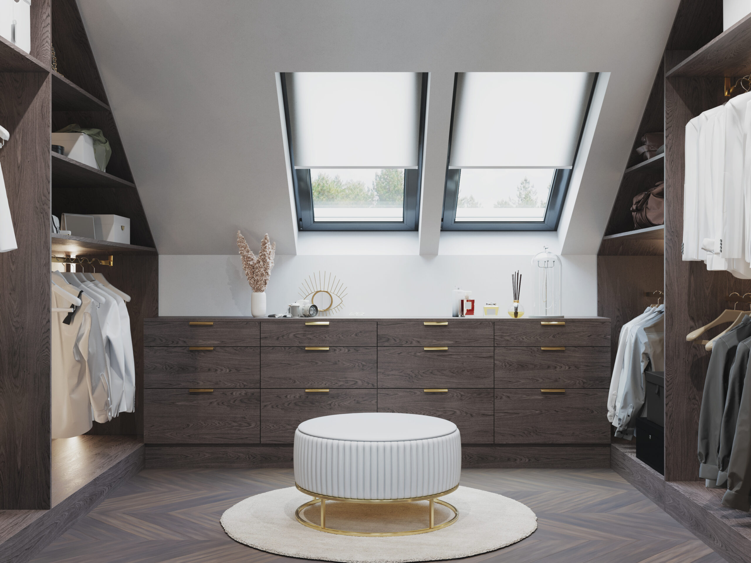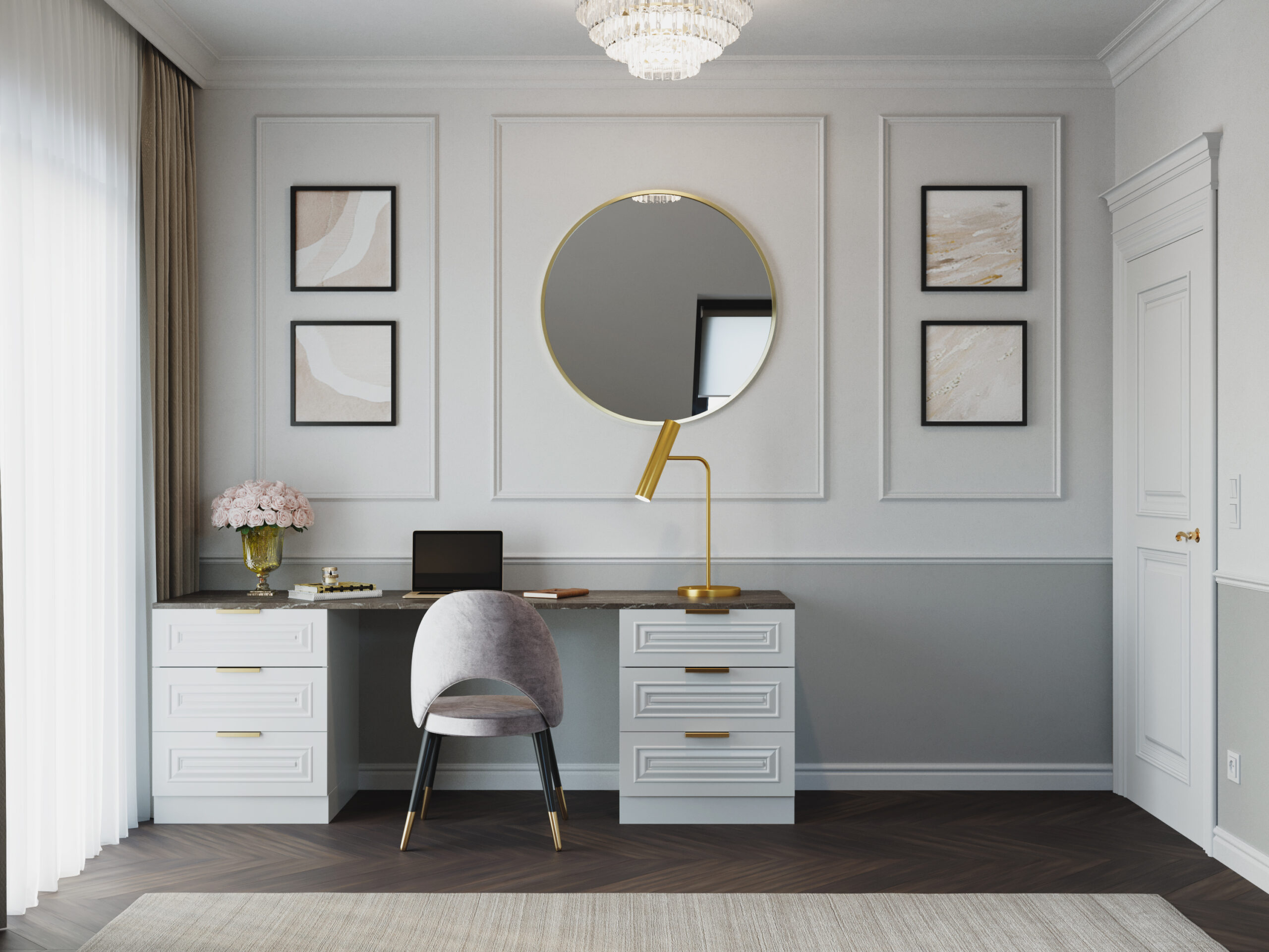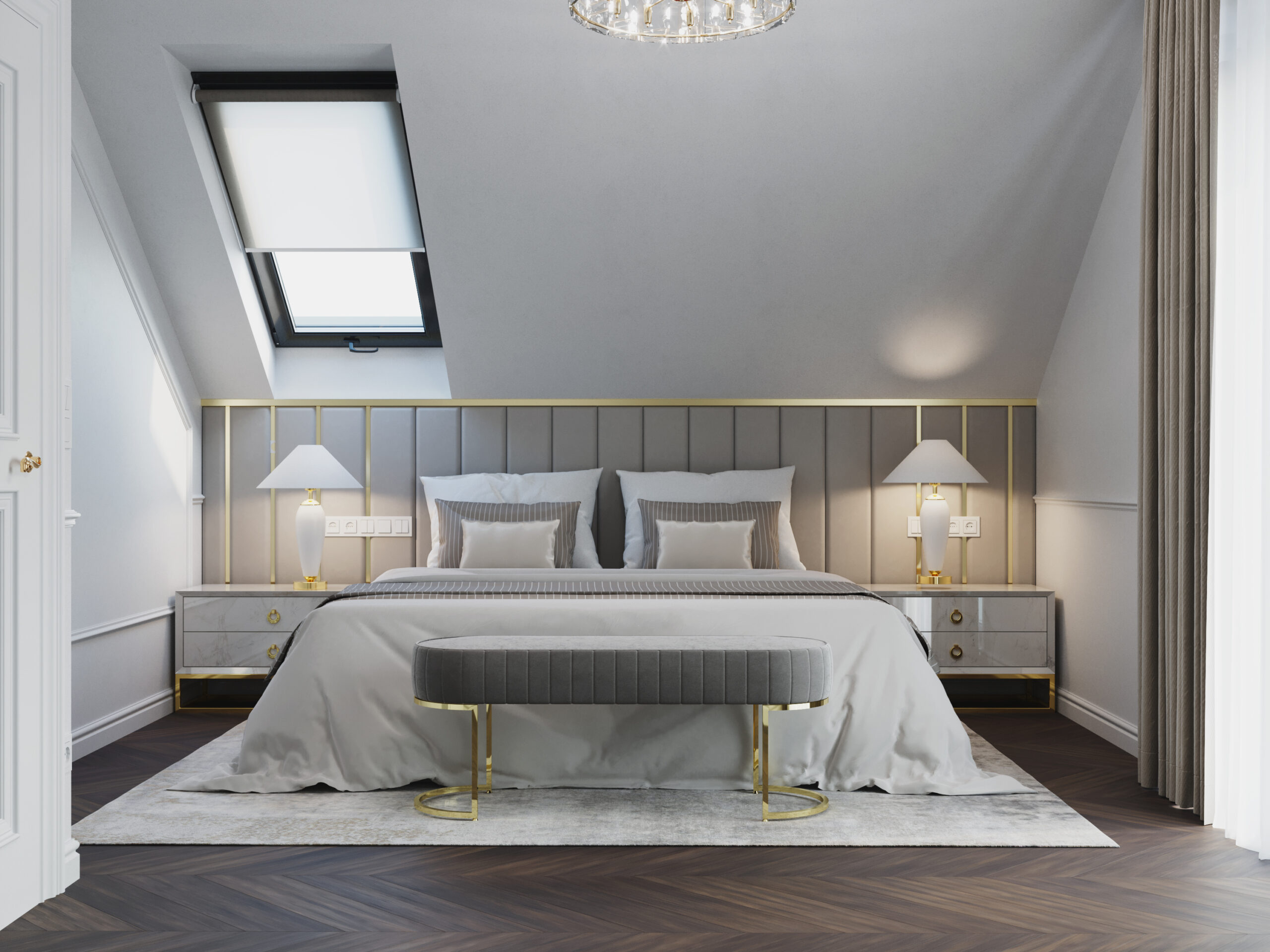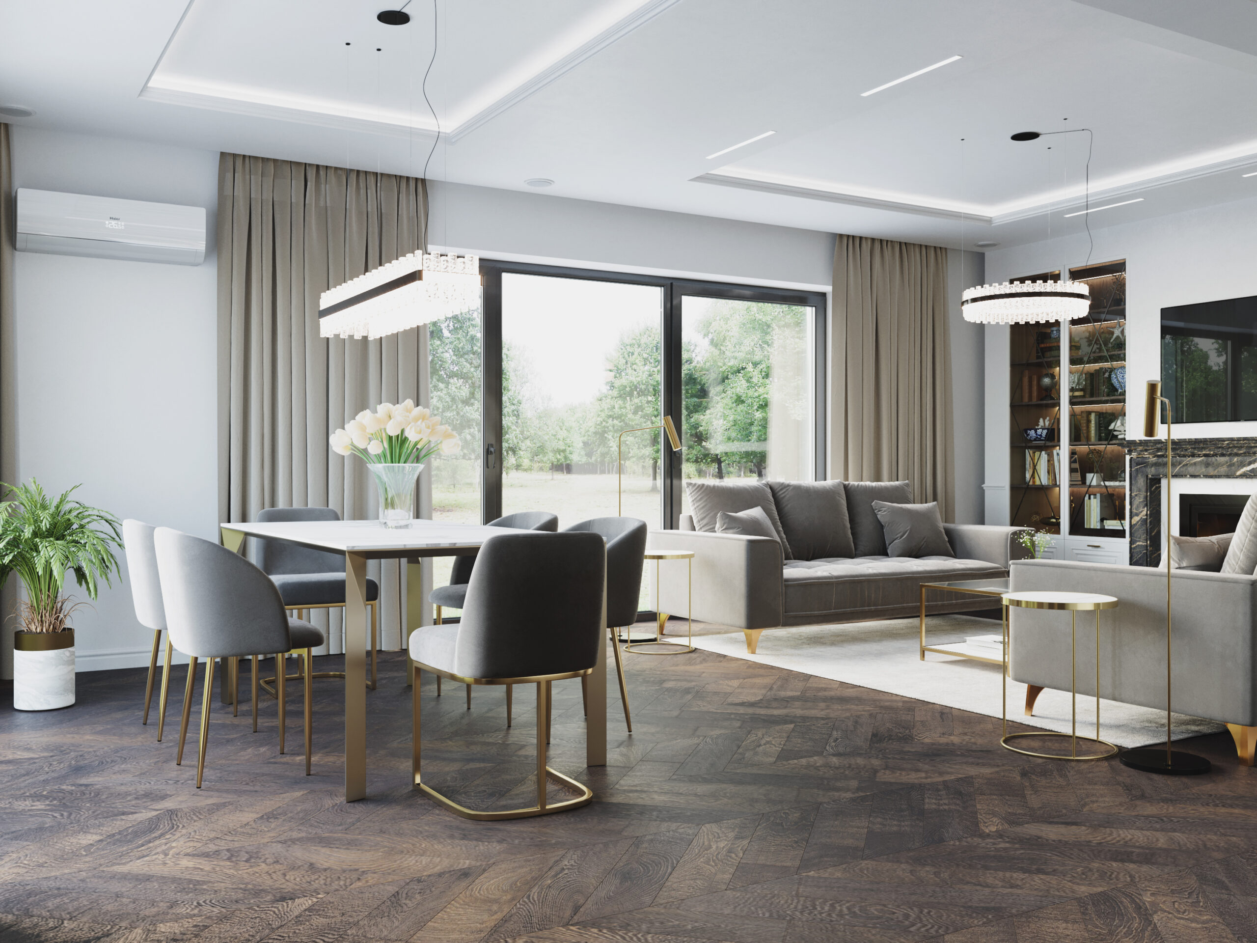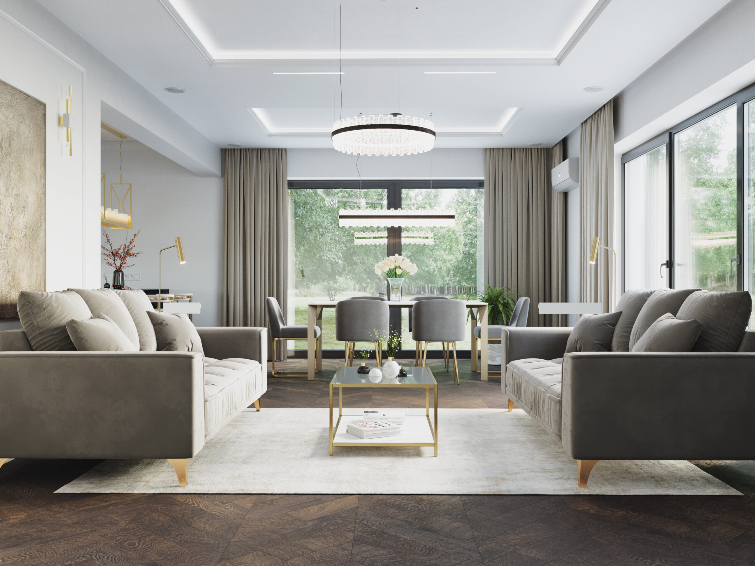 We wnętrzach królują złote akcenty, które nadają przestrzeni subtelnego blasku i luksusowego charakteru. Naturalny kamień podkreśla szlachetność aranżacji, a drewniana podłoga w jodełkę wprowadza rytm, ciepło i ponadczasową elegancję. Kontrast stanowi biała klasyczna stolarka drzwiowa oraz białe meble, które rozświetlają przestrzeń i sprawiają, że całość zyskuje lekkość oraz harmonię.