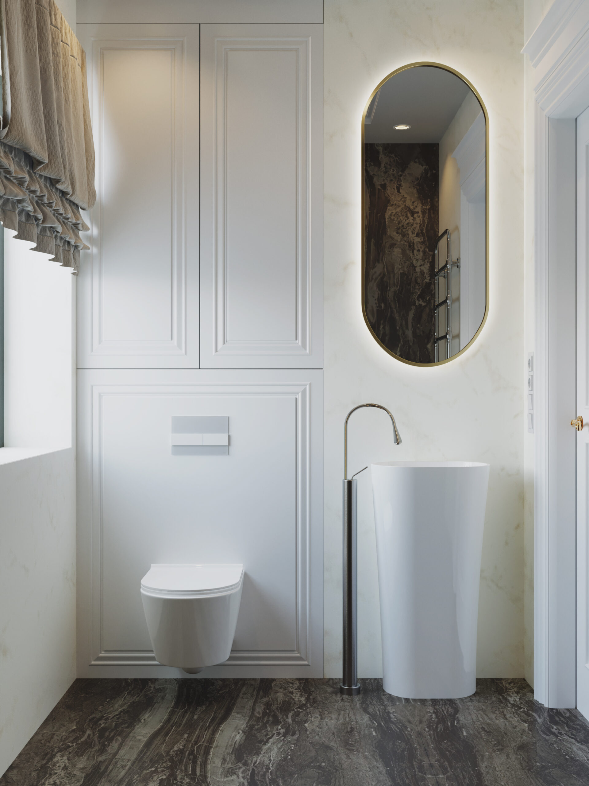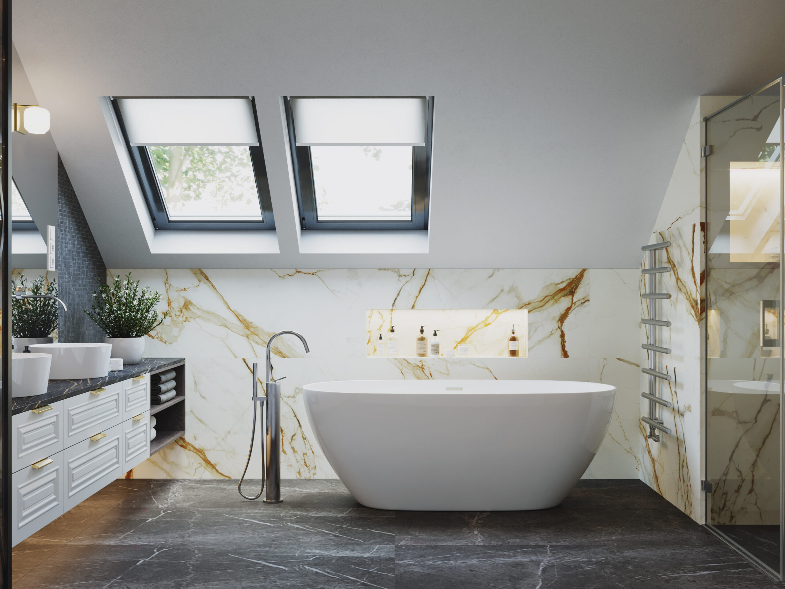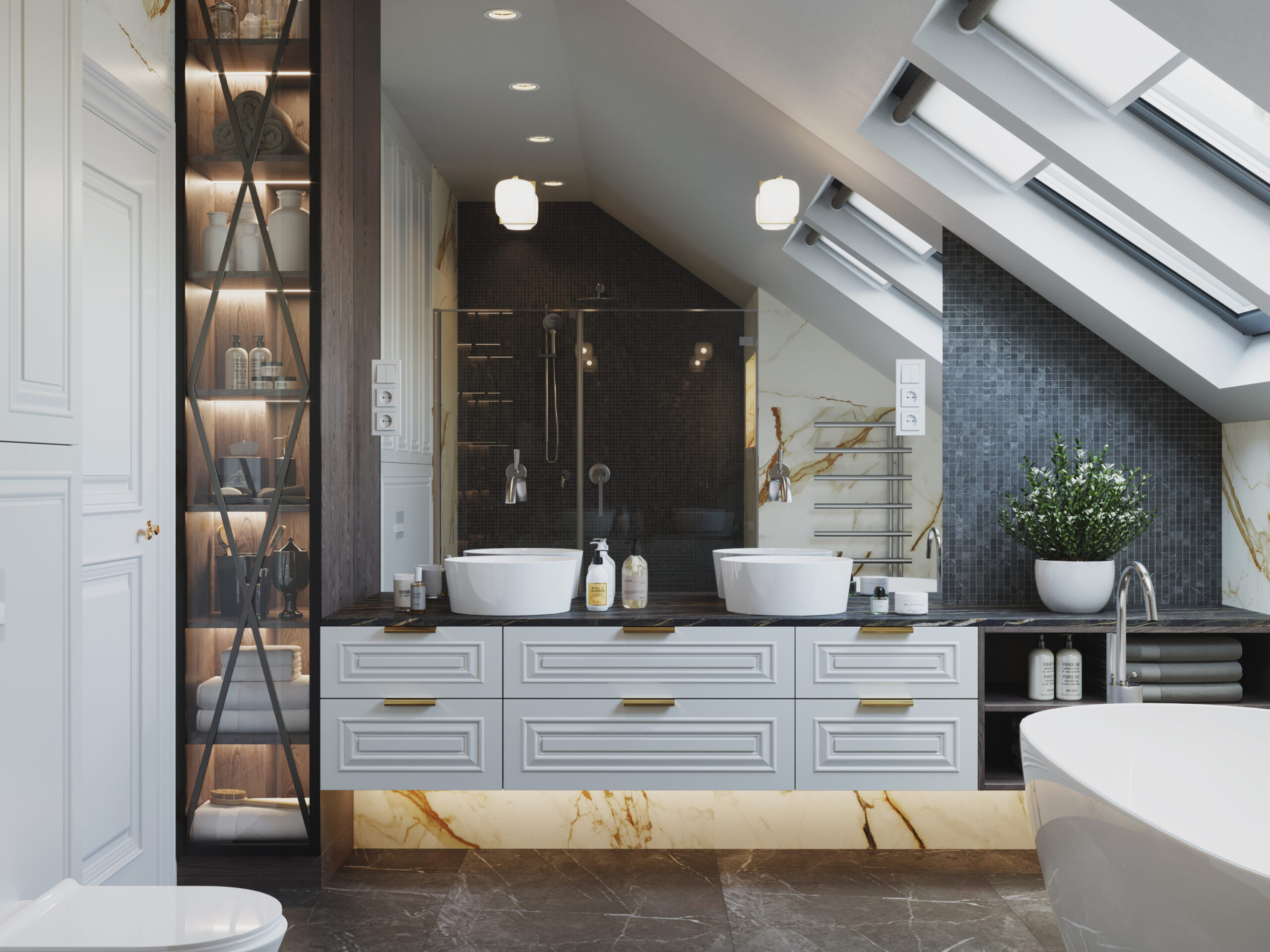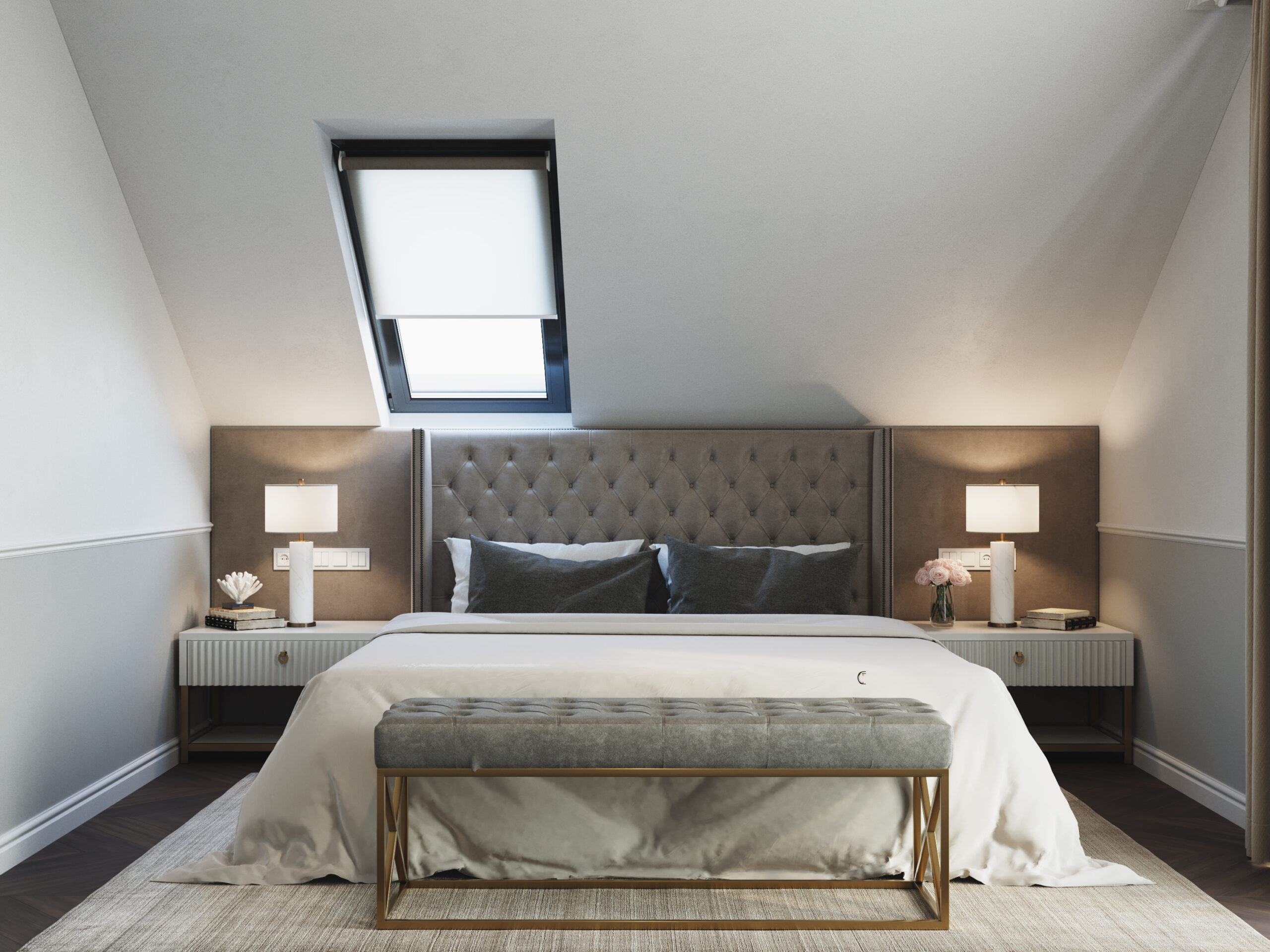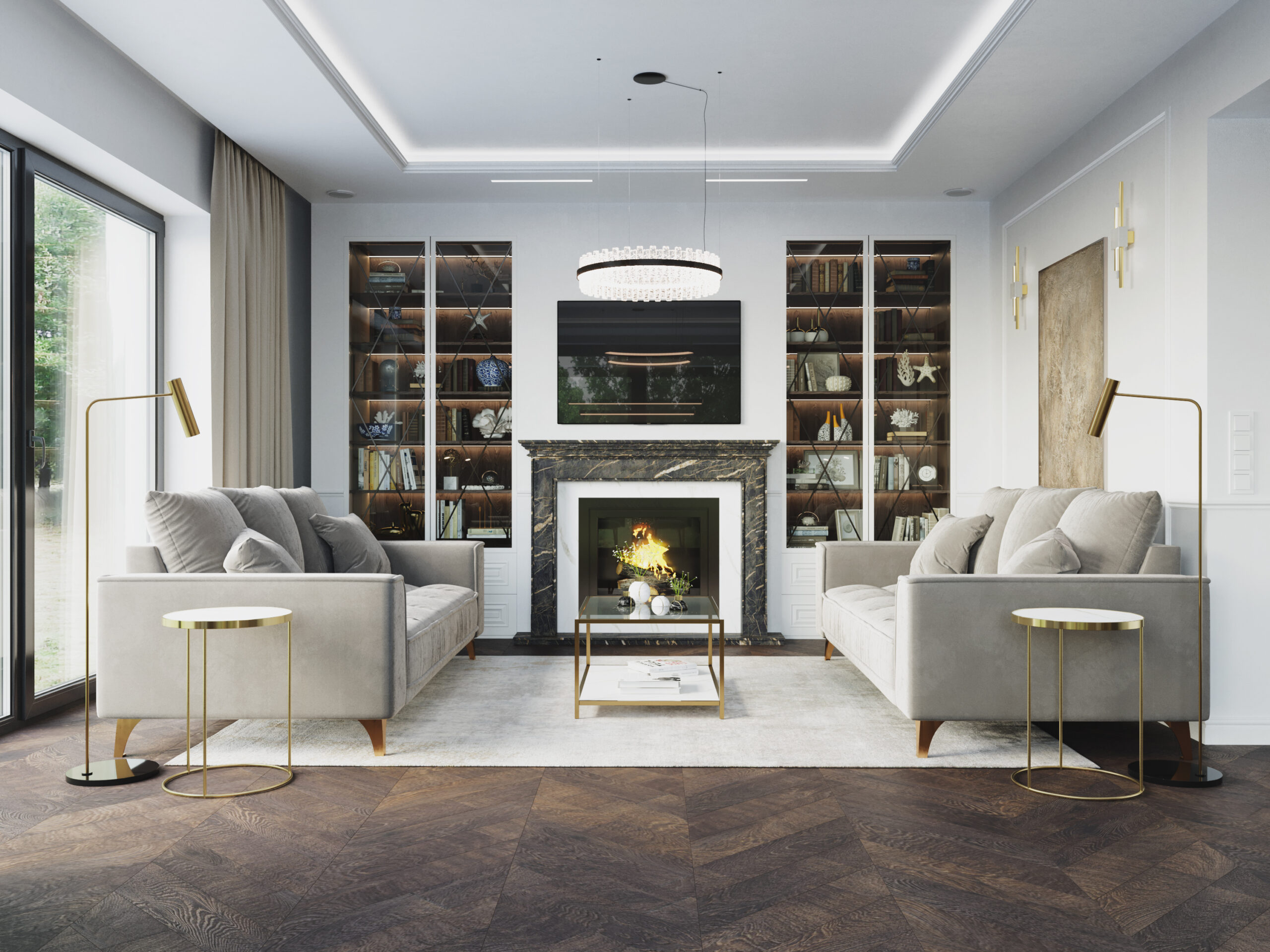 We wnętrzach królują złote akcenty, które nadają przestrzeni subtelnego blasku i luksusowego charakteru. Naturalny kamień podkreśla szlachetność aranżacji, a drewniana podłoga w jodełkę wprowadza rytm, ciepło i ponadczasową elegancję. Kontrast stanowi biała klasyczna stolarka drzwiowa oraz białe meble, które rozświetlają przestrzeń i sprawiają, że całość zyskuje lekkość oraz harmonię.