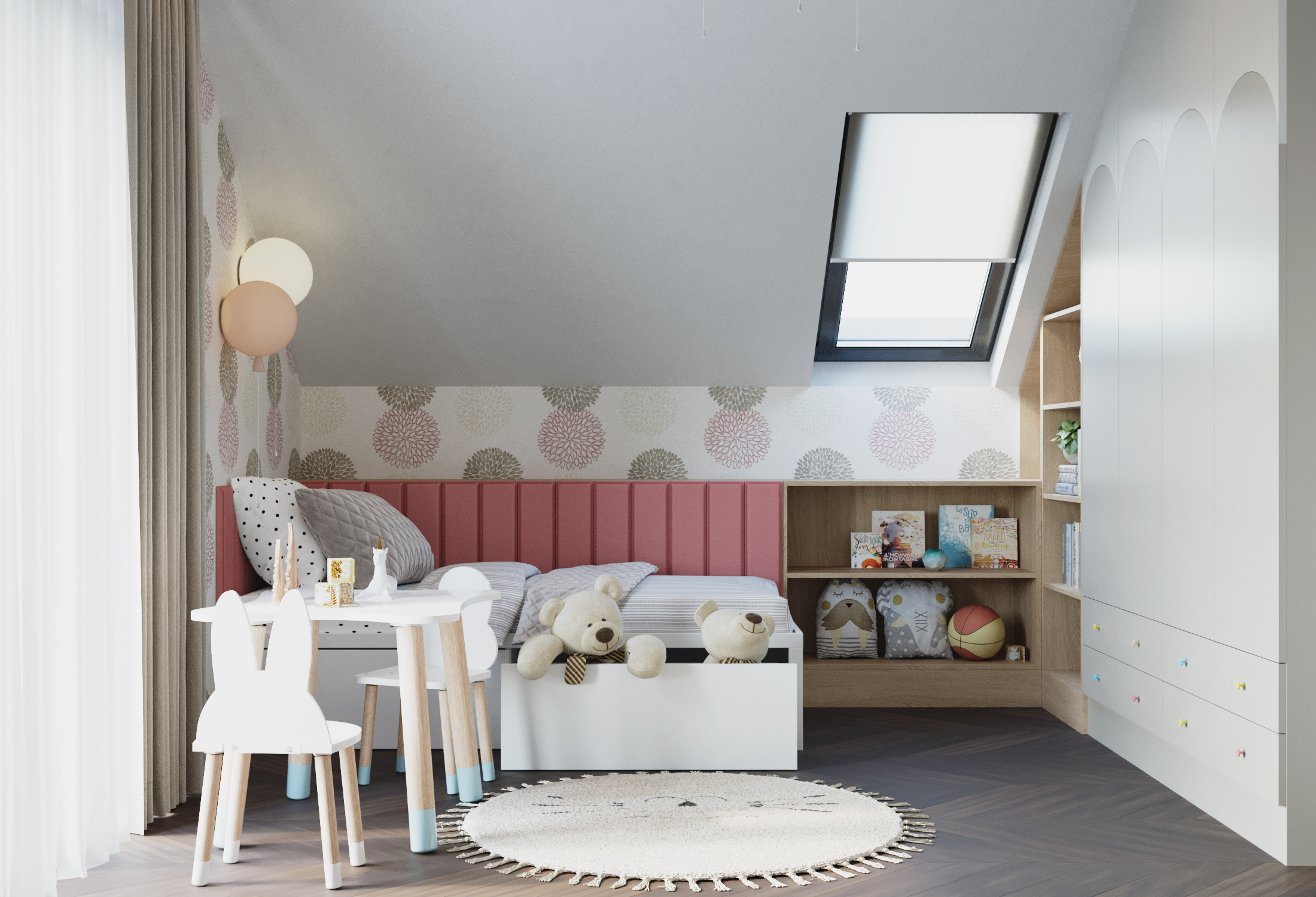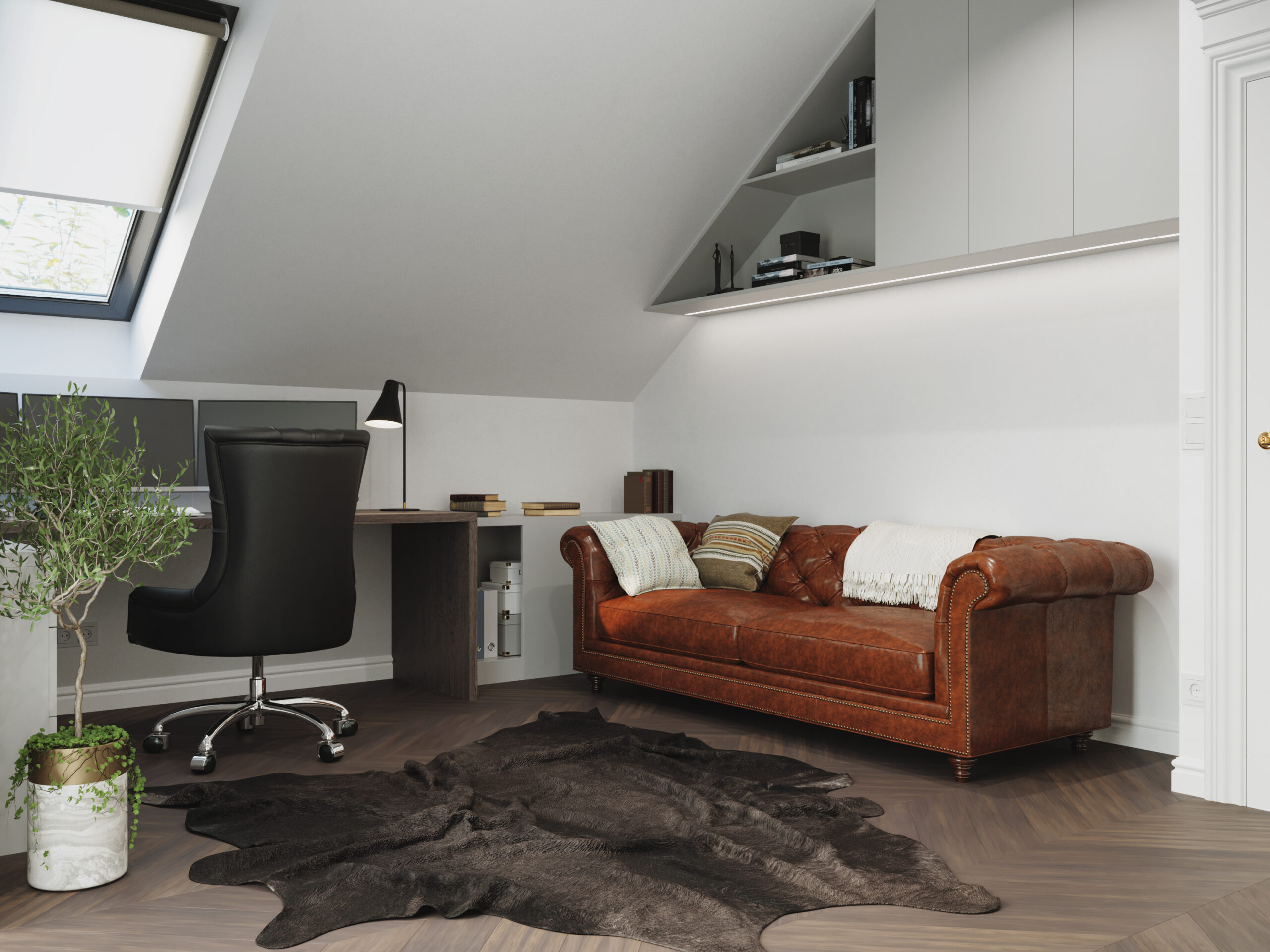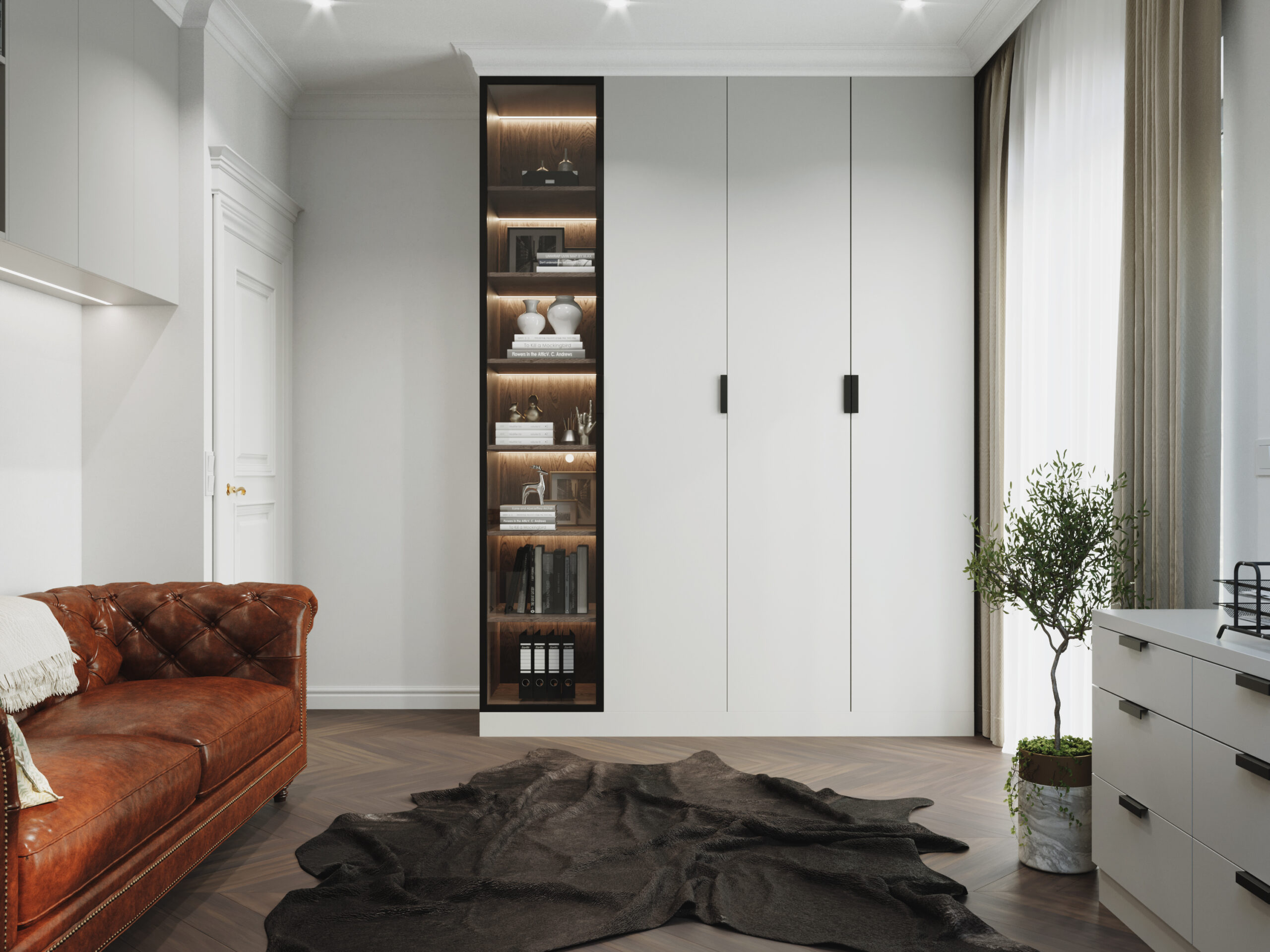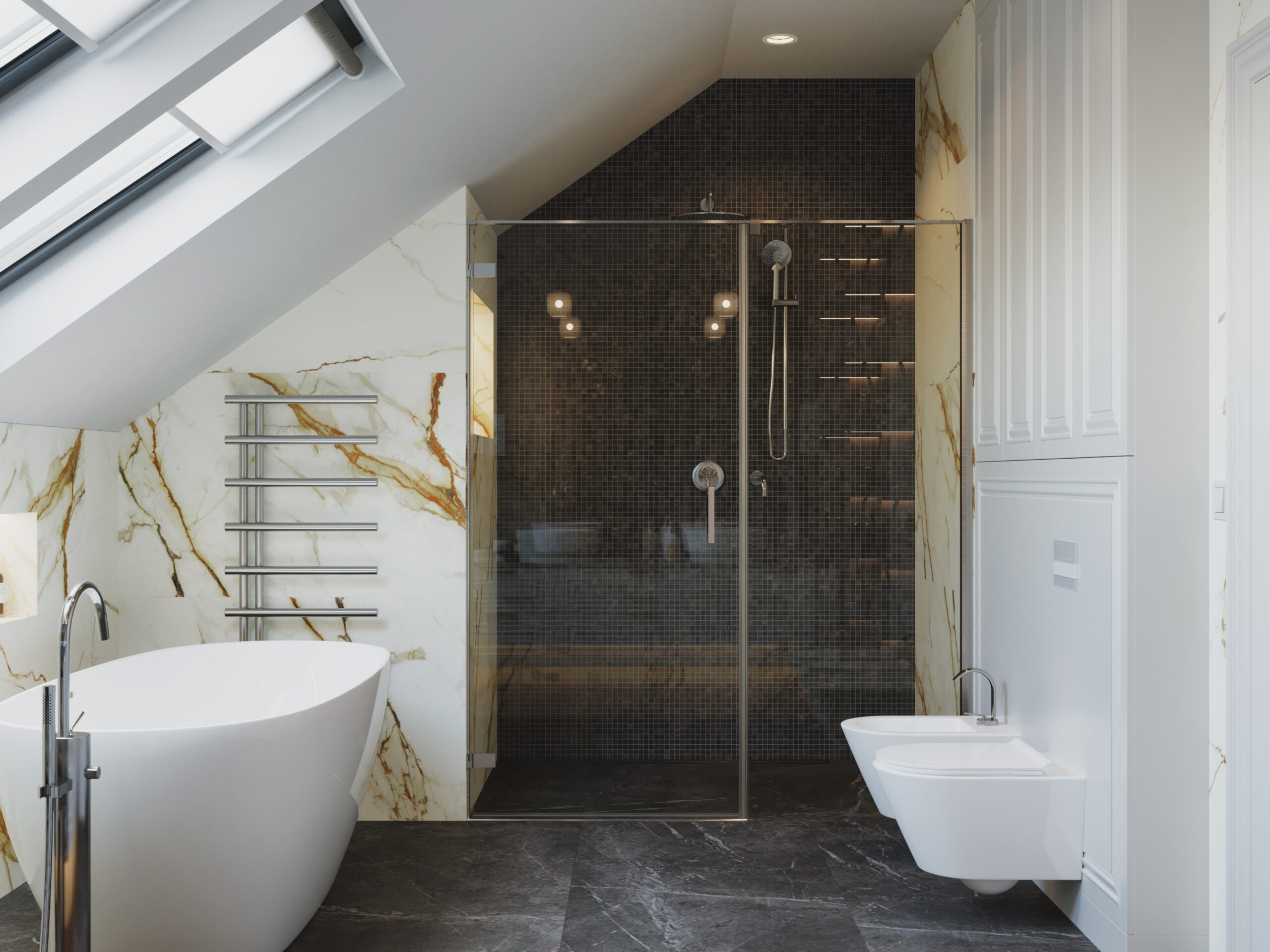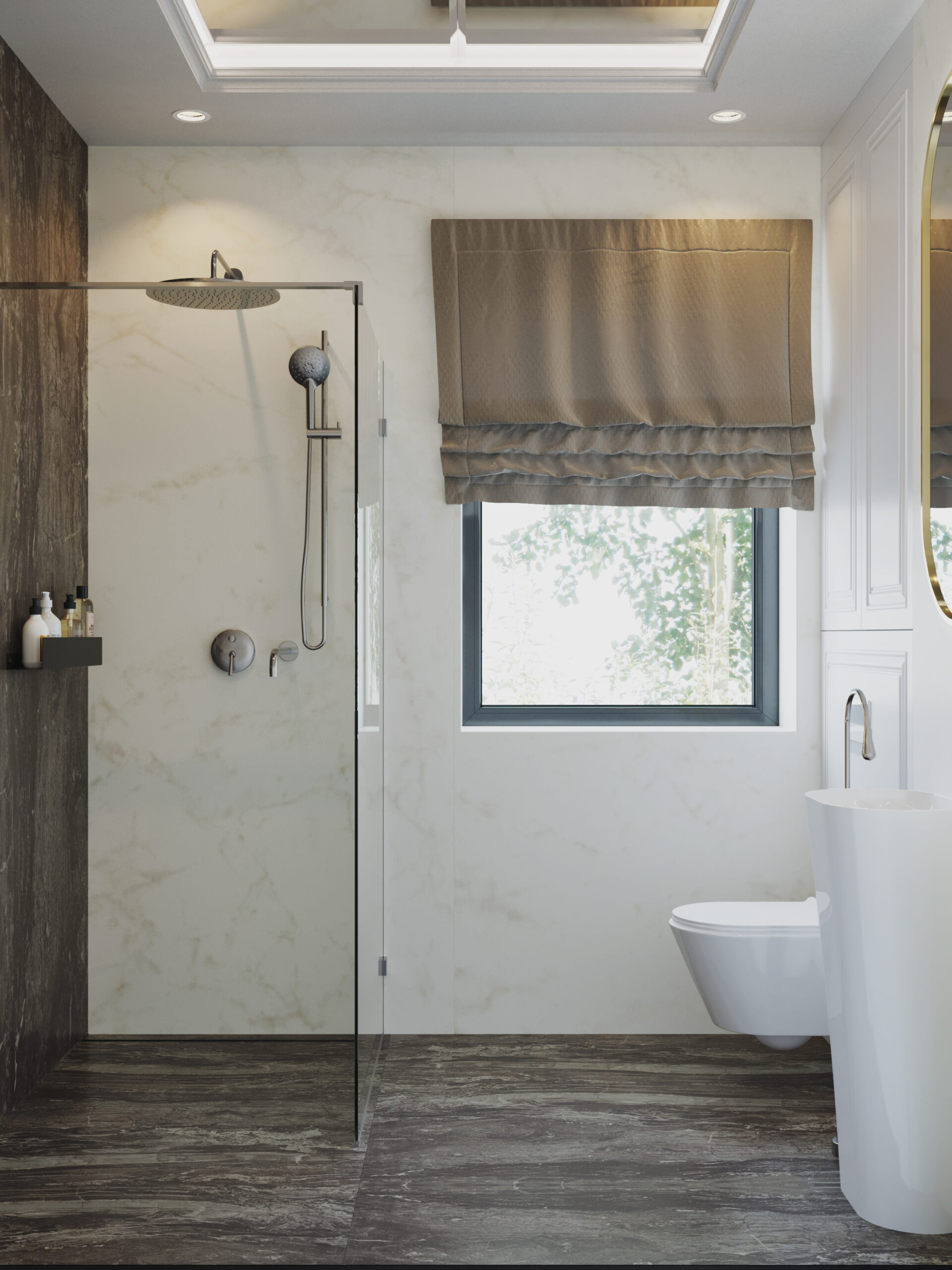 We wnętrzach królują złote akcenty, które nadają przestrzeni subtelnego blasku i luksusowego charakteru. Naturalny kamień podkreśla szlachetność aranżacji, a drewniana podłoga w jodełkę wprowadza rytm, ciepło i ponadczasową elegancję. Kontrast stanowi biała klasyczna stolarka drzwiowa oraz białe meble, które rozświetlają przestrzeń i sprawiają, że całość zyskuje lekkość oraz harmonię.