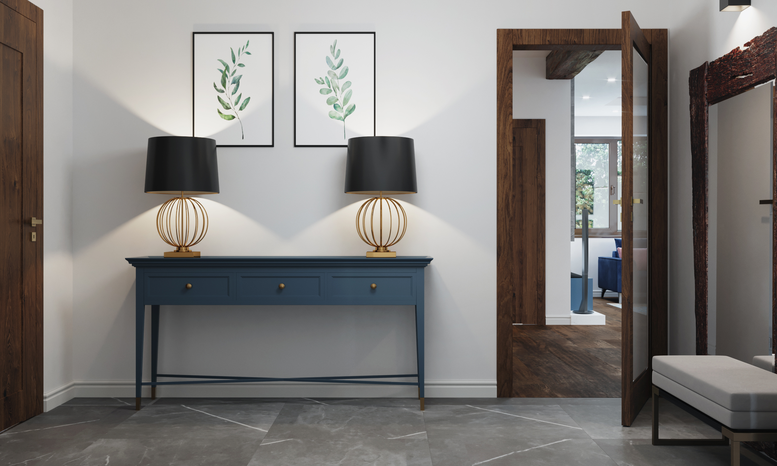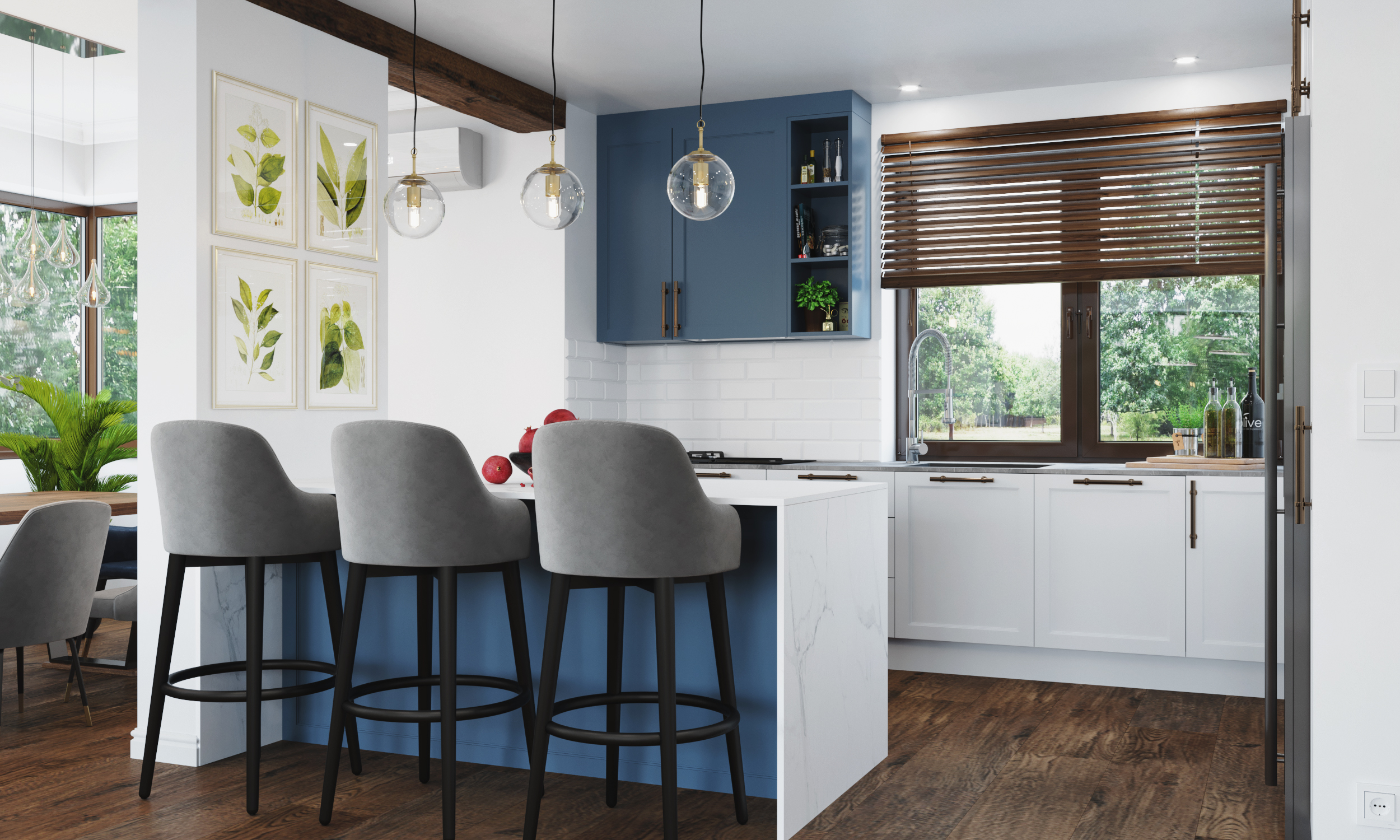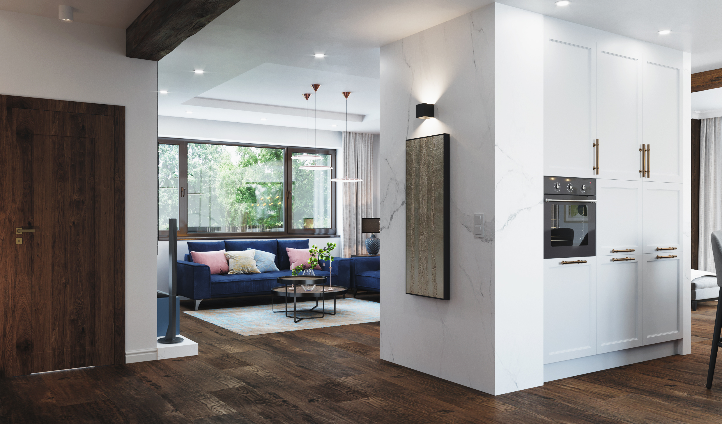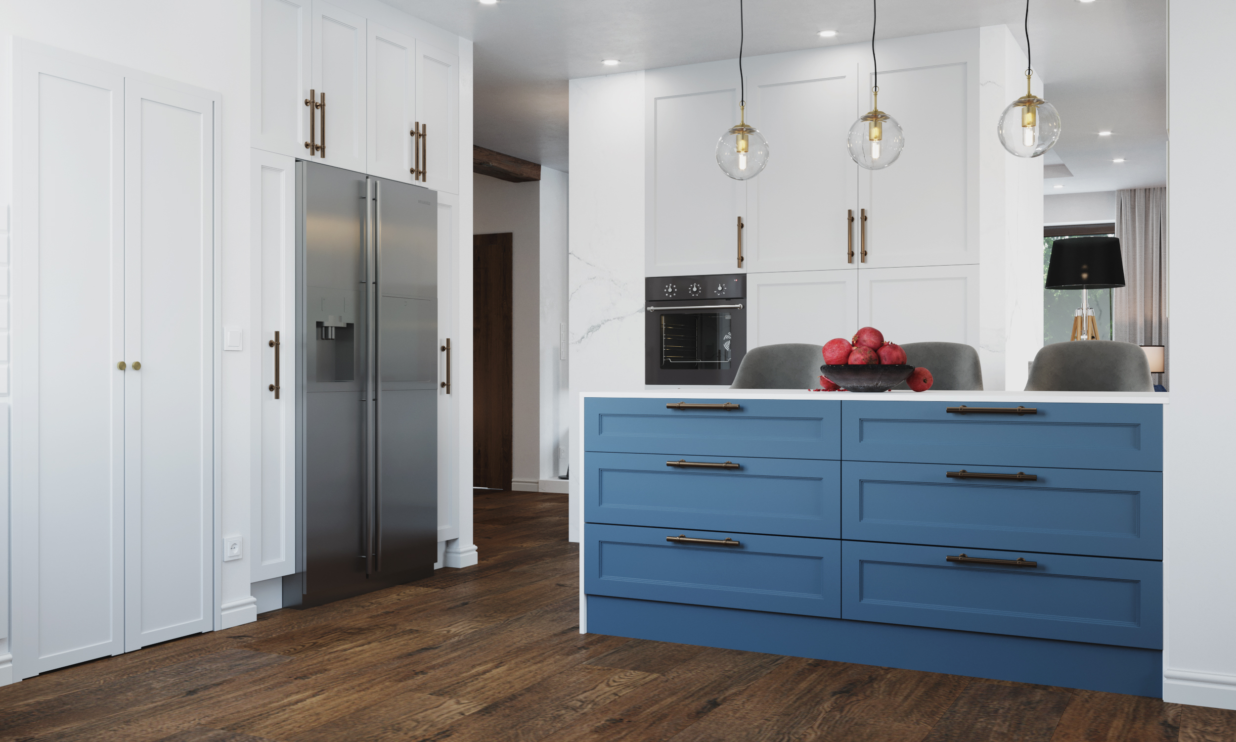 Wnętrza domu charakteryzuje ciemna, drewniana podłoga, która nadaje przestrzeni głębi i prestiżu. Podłoga doskonale współgra ze stolarką drzwiową wykonaną na zamówienie — meble, drzwi i detale stolarskie zostały zaprojektowane i wykonane tak, by podkreślać charakter domu, jednocześnie wpisując się w spójny styl całej aranżacji.