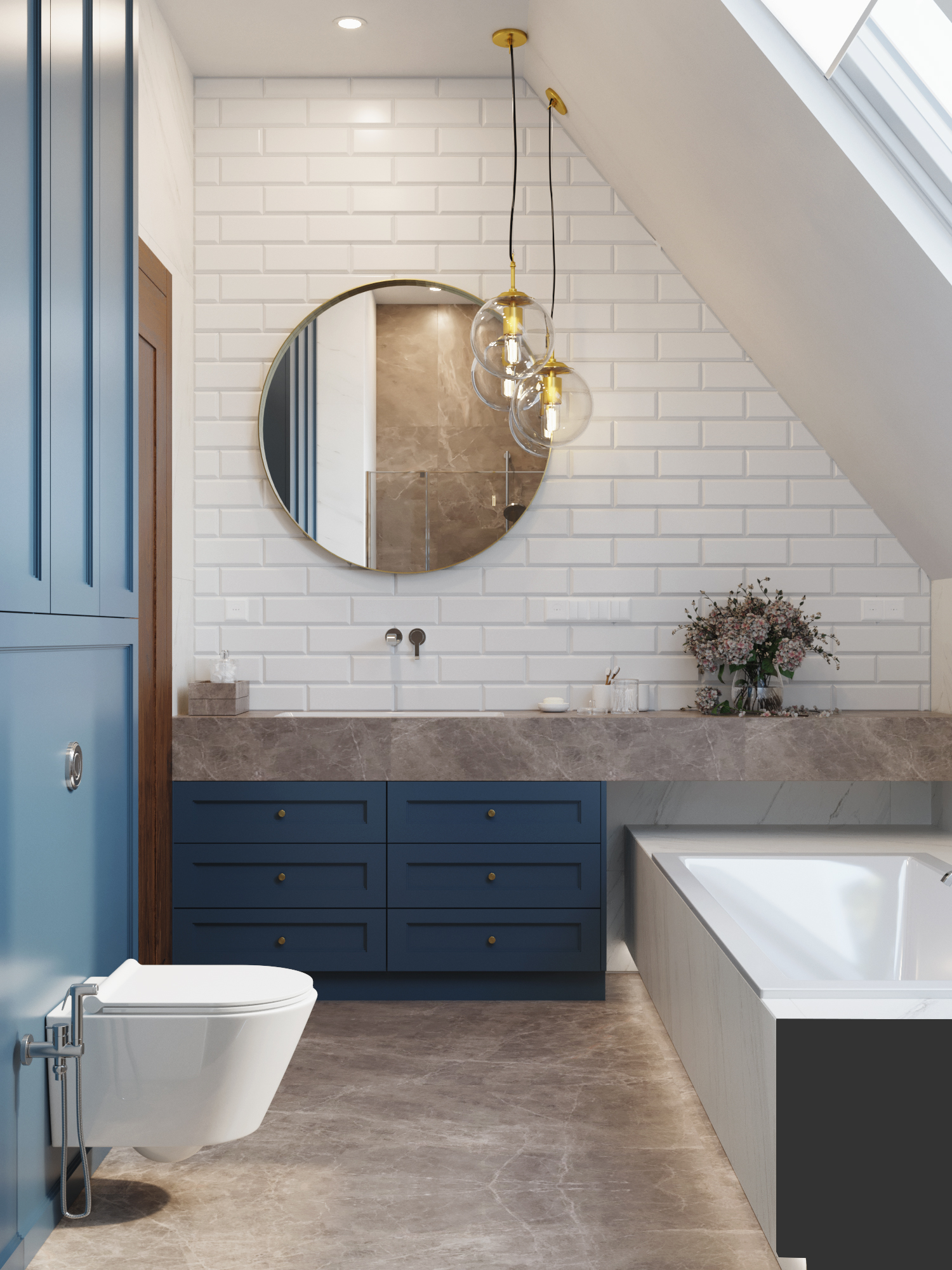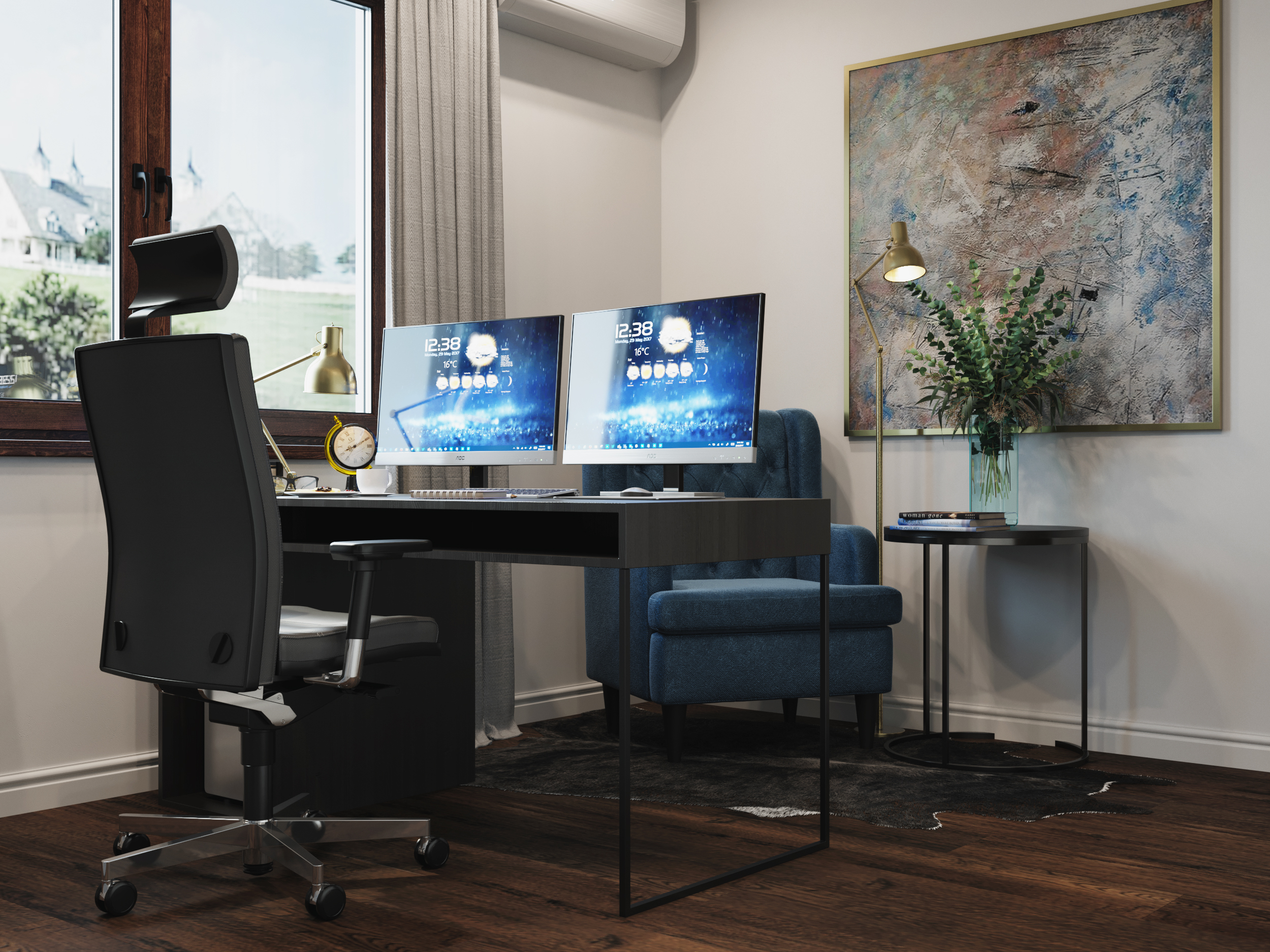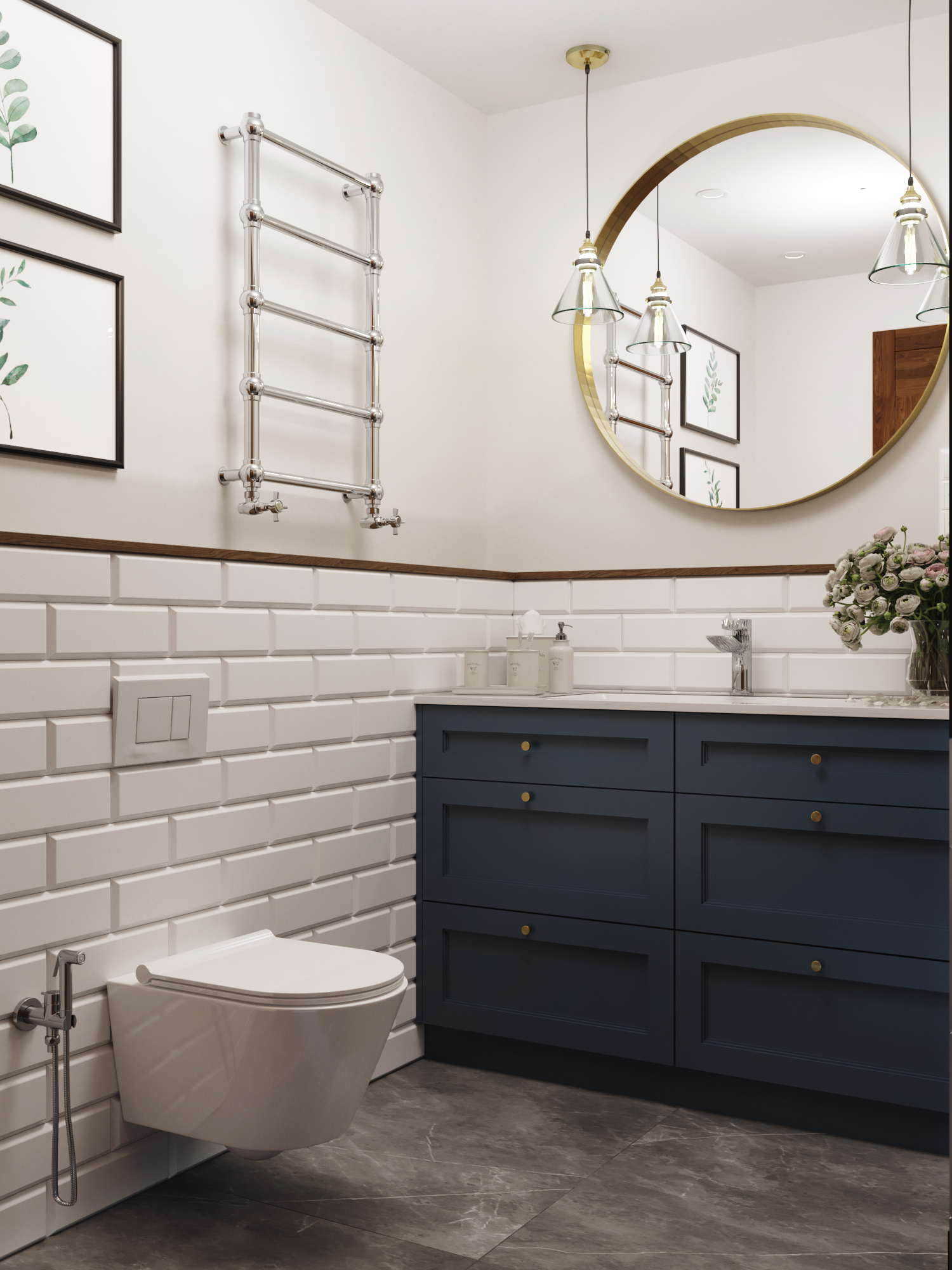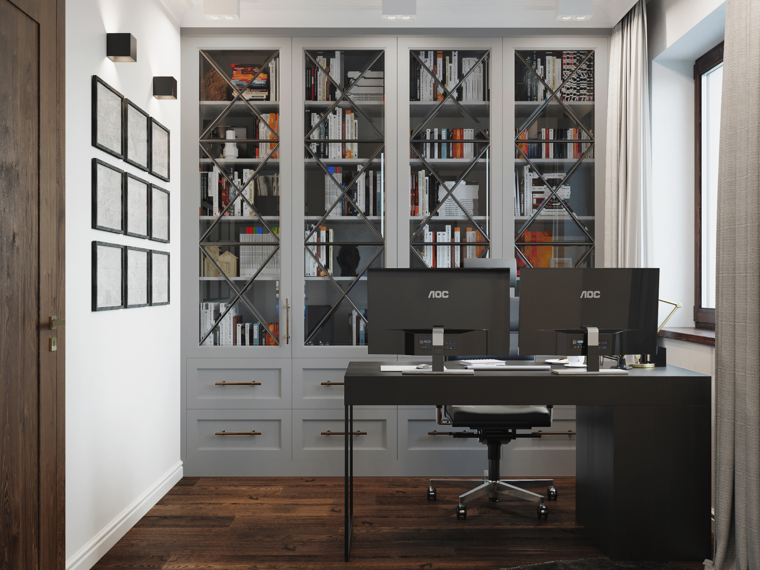 Wnętrza domu charakteryzuje ciemna, drewniana podłoga, która nadaje przestrzeni głębi i prestiżu. Podłoga doskonale współgra ze stolarką drzwiową wykonaną na zamówienie — meble, drzwi i detale stolarskie zostały zaprojektowane i wykonane tak, by podkreślać charakter domu, jednocześnie wpisując się w spójny styl całej aranżacji.