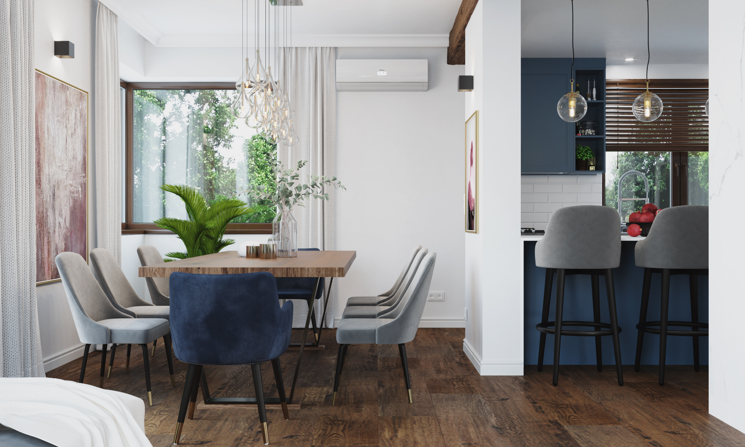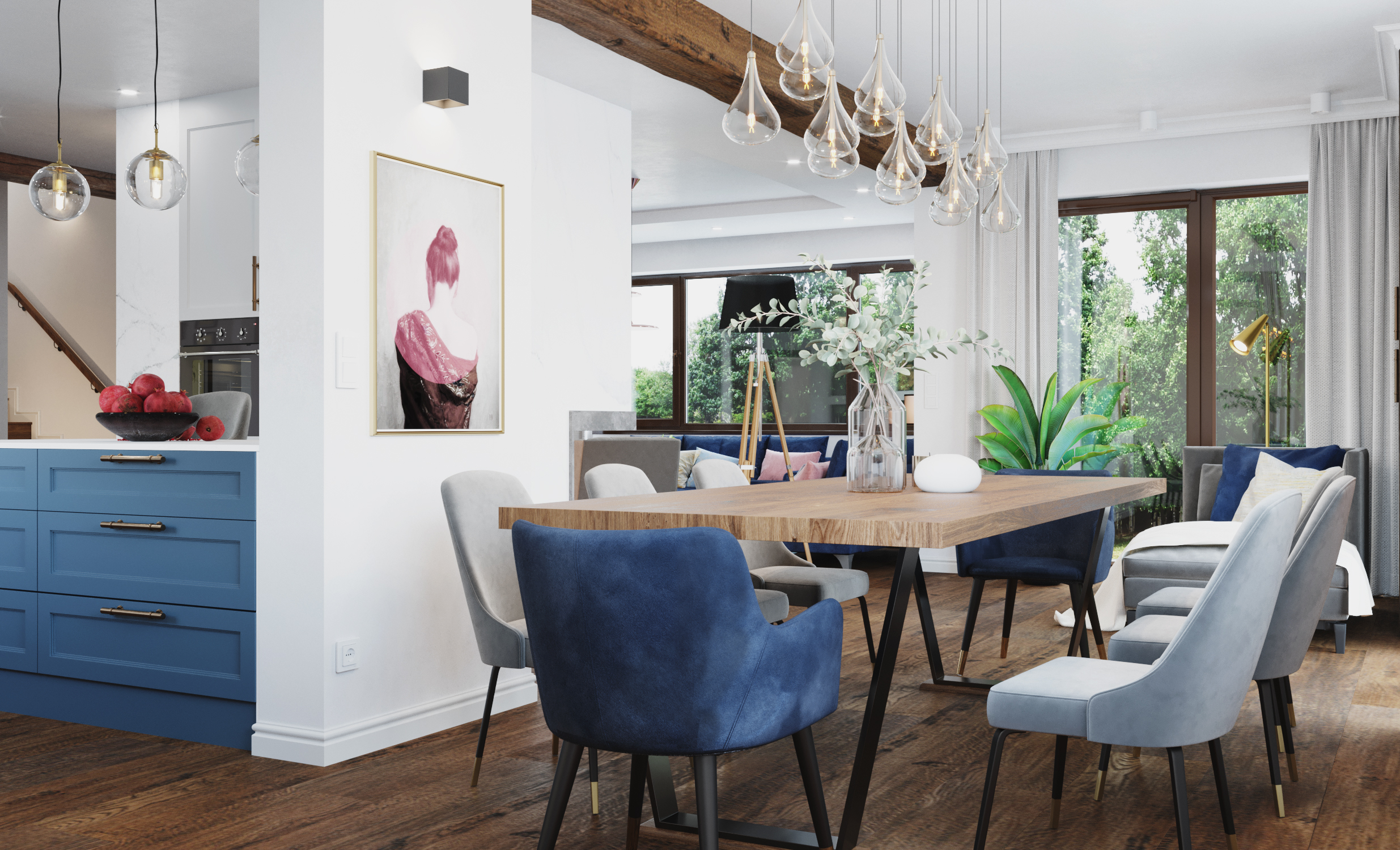 Kolorystyka wnętrz została dopełniona mocnymi akcentami – barwy zdecydowane, autentyczne, które ożywiają przestrzeń, dodają jej energii i osobowości. Dzięki nim dom nie jest jedynie elegancki, ale też pełen charakteru.
