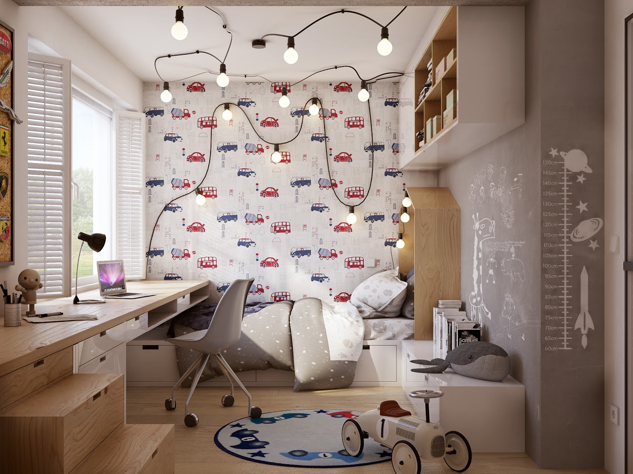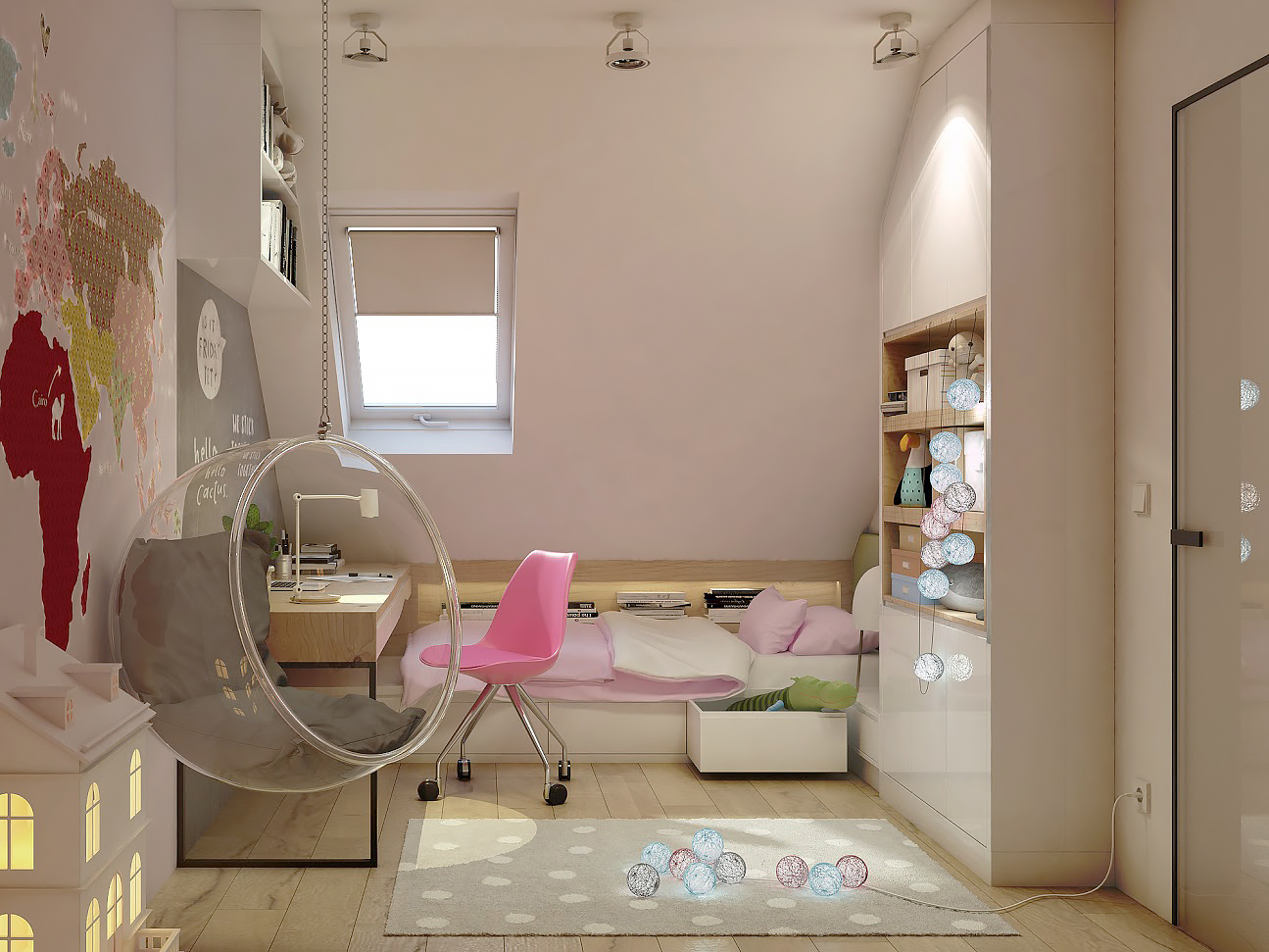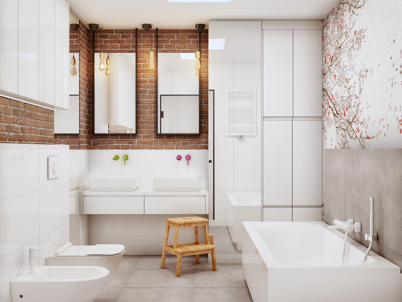 Piętro zostało zaprojektowane tak, aby pełnić funkcję samodzielnej strefy dla dzieci, z własną kuchnią i pokojami, a jednocześnie znalazło się miejsce na męską jaskinię – siłownię z telewizorem i praktycznym miejscem do przechowywania rowerów. Ta część mieszkania łączy w sobie funkcjonalność, wygodę i przestrzeń do relaksu oraz aktywności fizycznej.