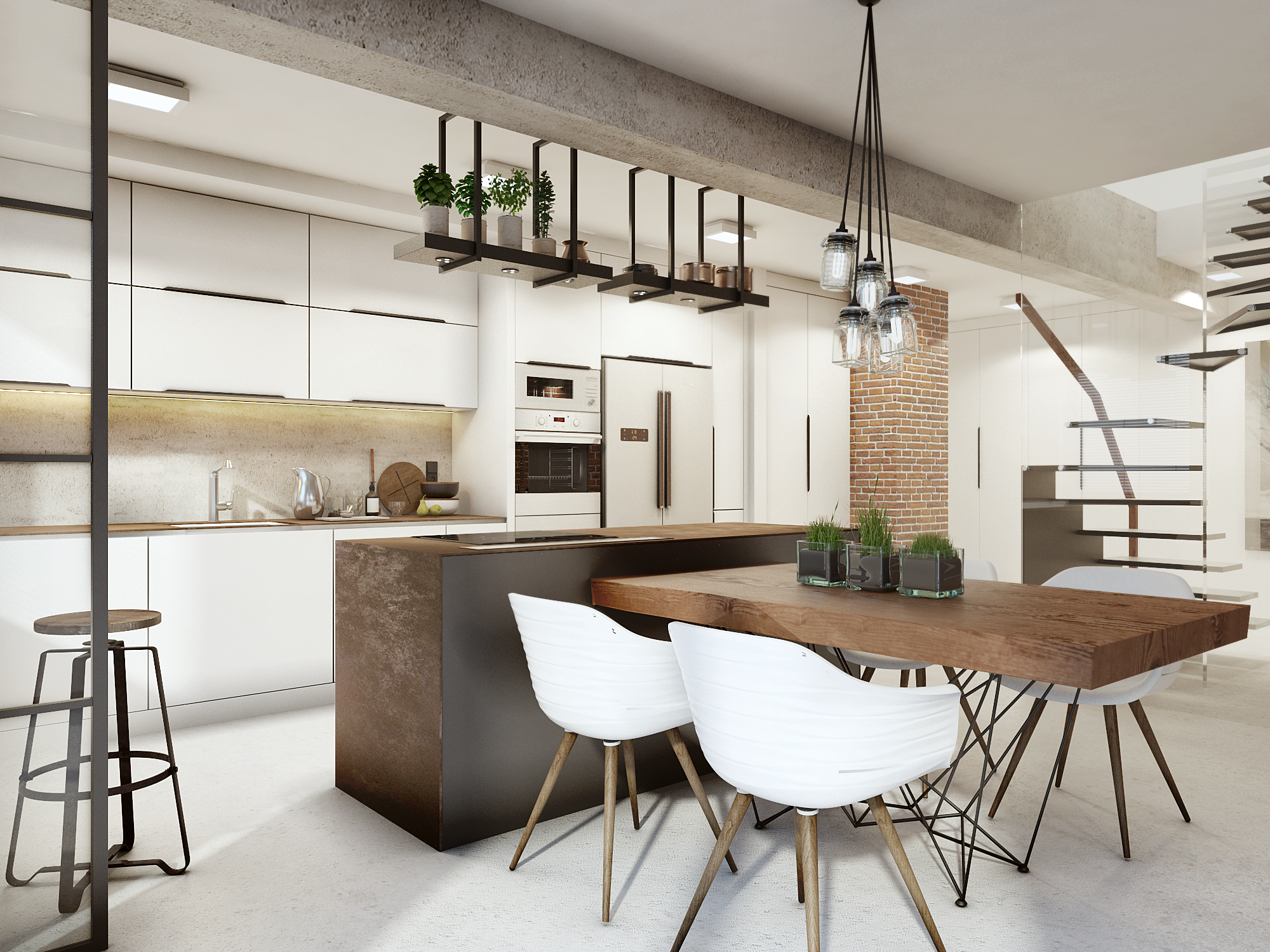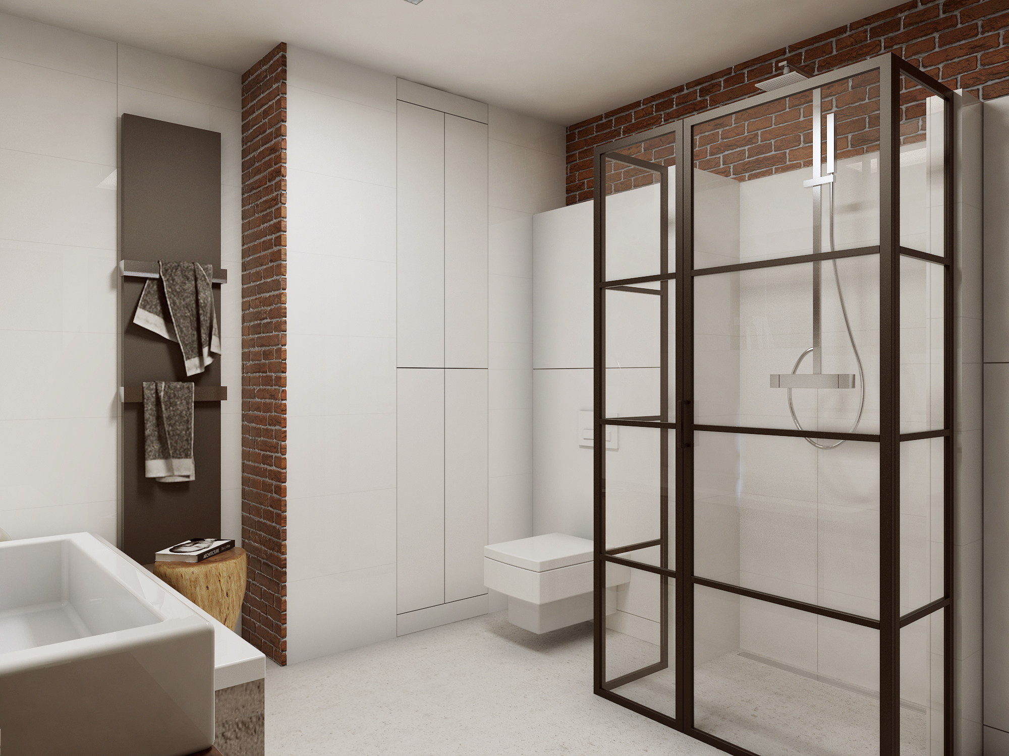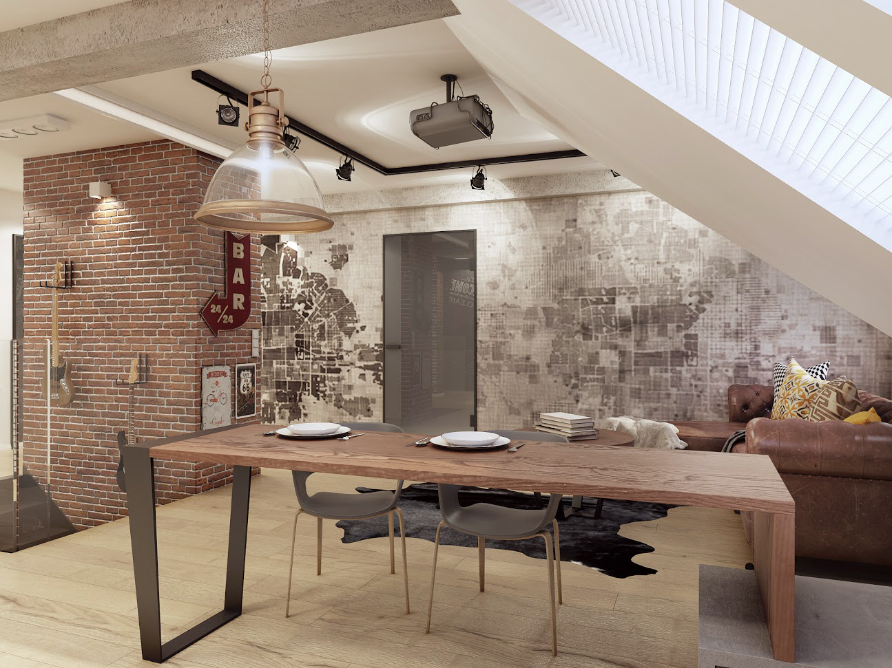 Całość projektu wyróżnia męski charakter, przełamany przytulnymi akcentami, dzięki czemu wnętrze jest eleganckie i przyjazne. W aranżacji wykorzystano naturalne materiały: starą cegłę, drewno oraz kamień, które nadają wnętrzu niepowtarzalny charakter i podkreślają wysoką jakość wykończenia.