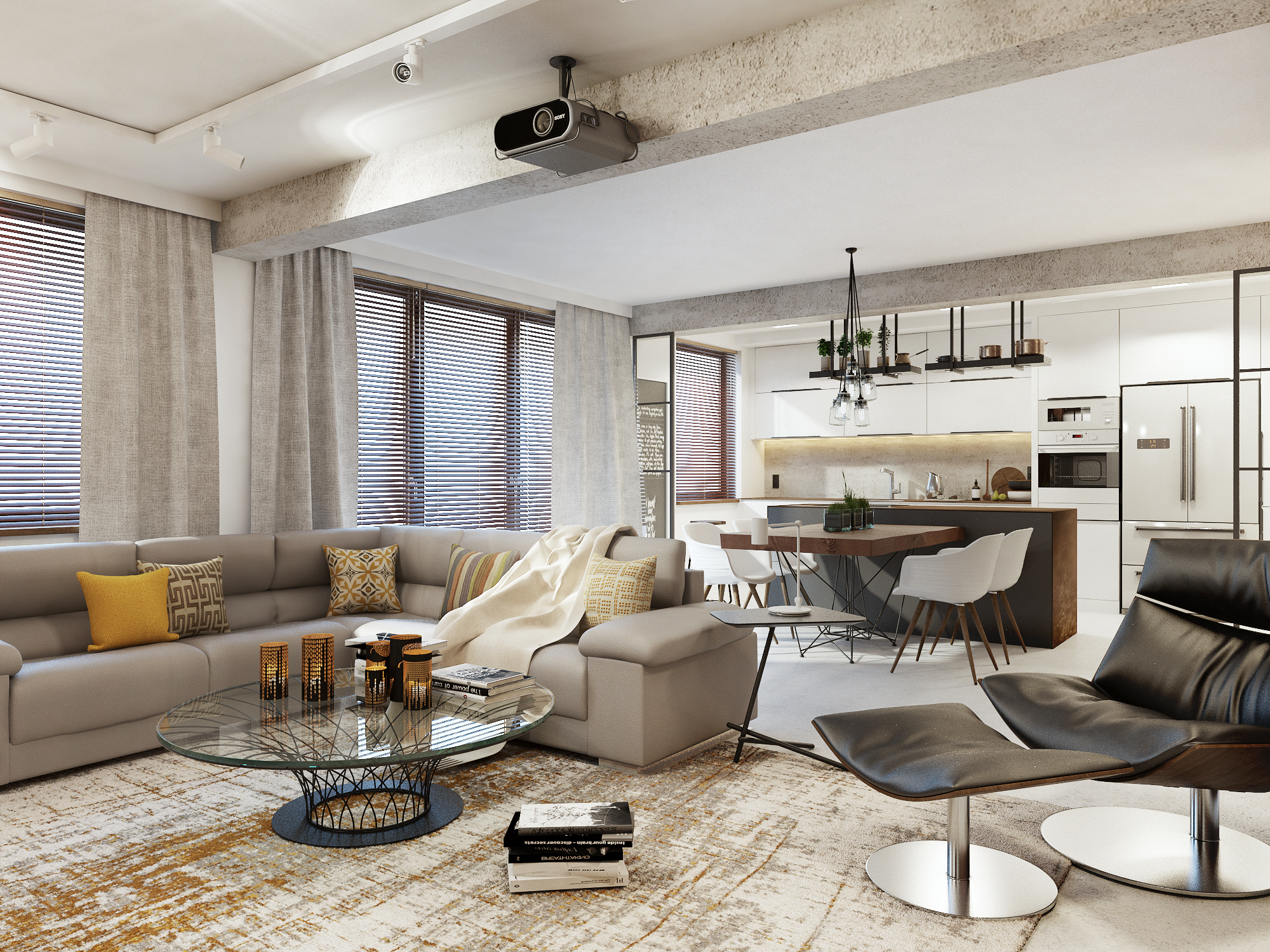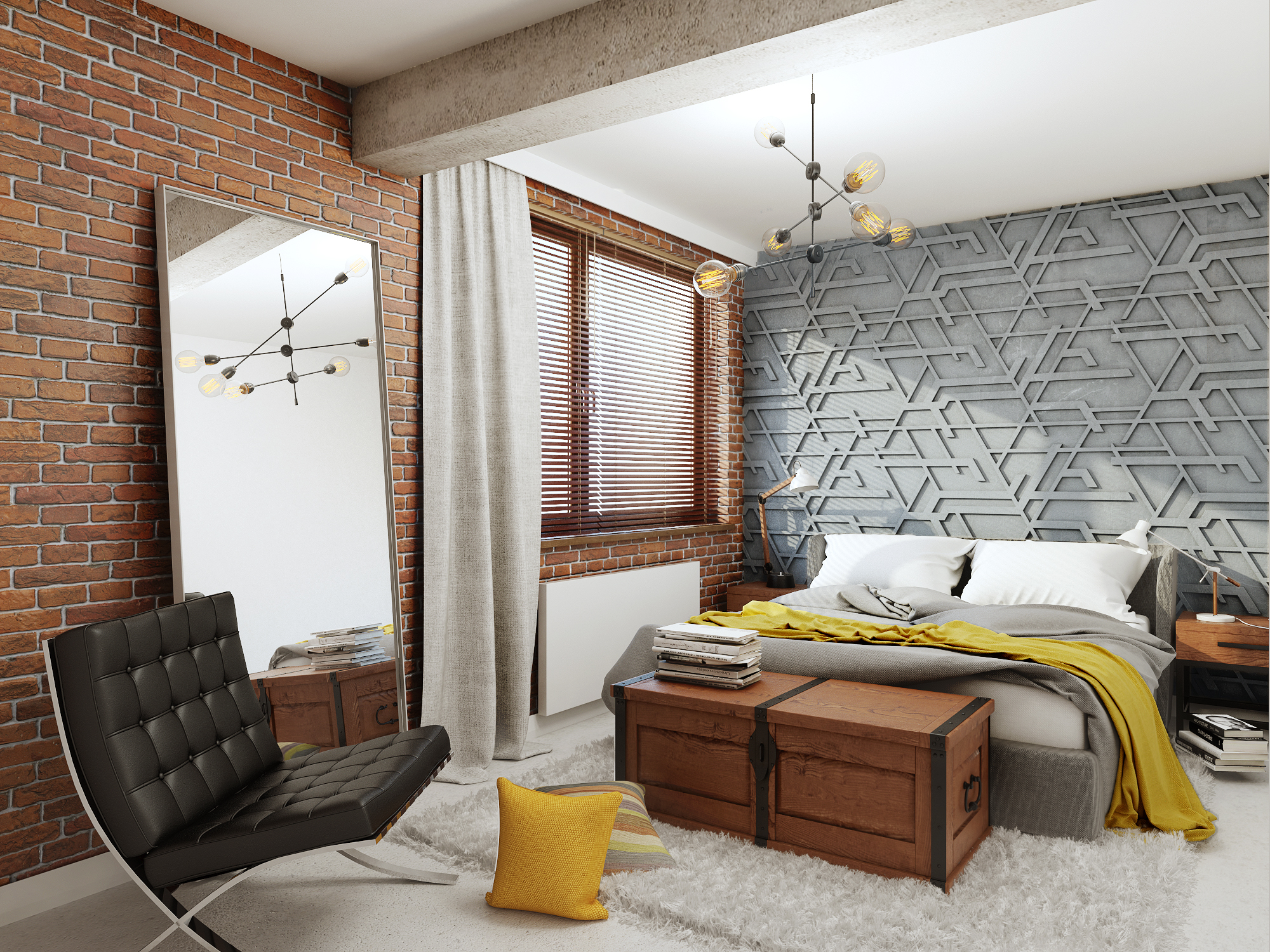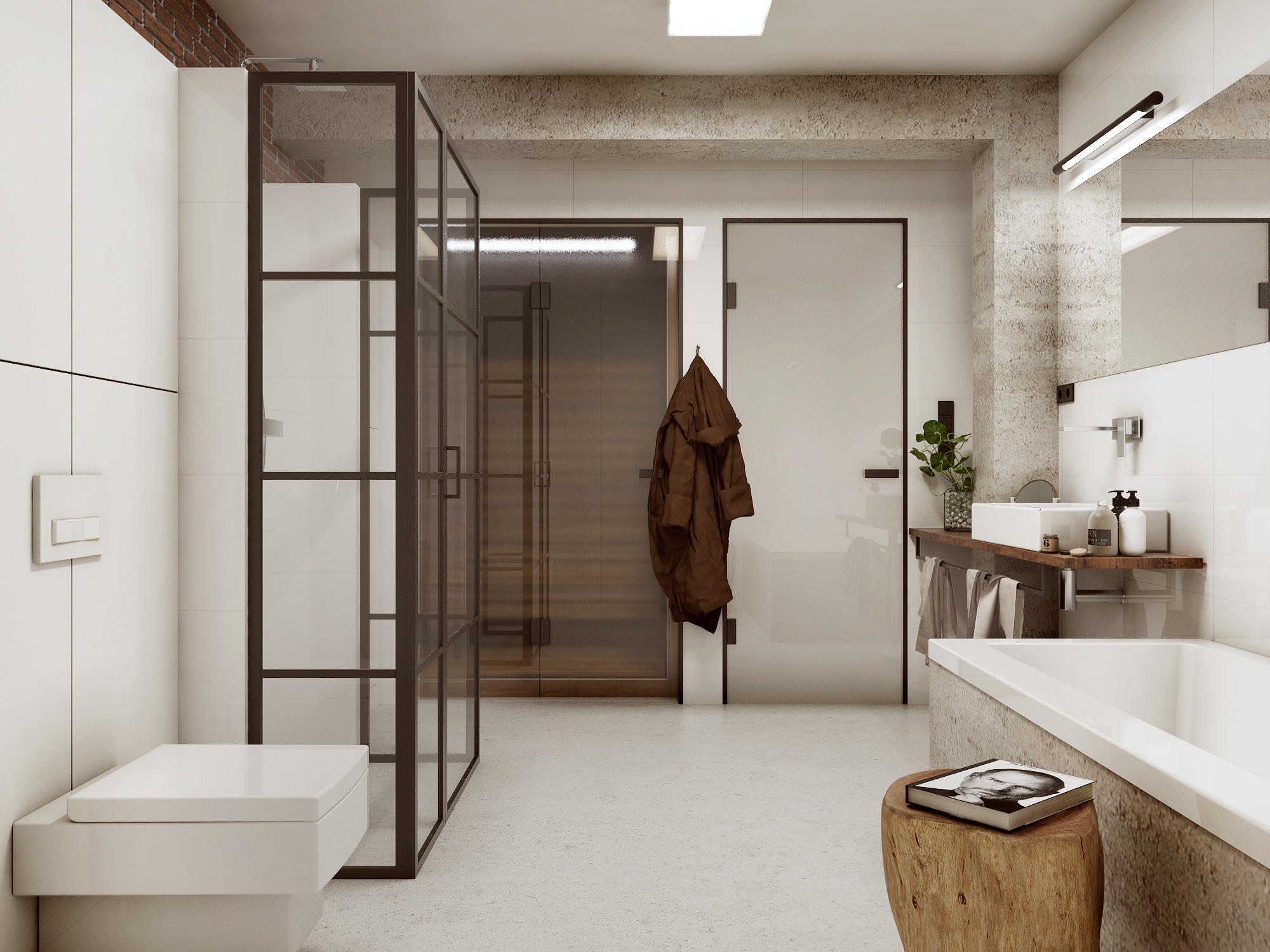 Całość projektu wyróżnia męski charakter, przełamany przytulnymi akcentami, dzięki czemu wnętrze jest eleganckie i przyjazne. W aranżacji wykorzystano naturalne materiały: starą cegłę, drewno oraz kamień, które nadają wnętrzu niepowtarzalny charakter i podkreślają wysoką jakość wykończenia.
