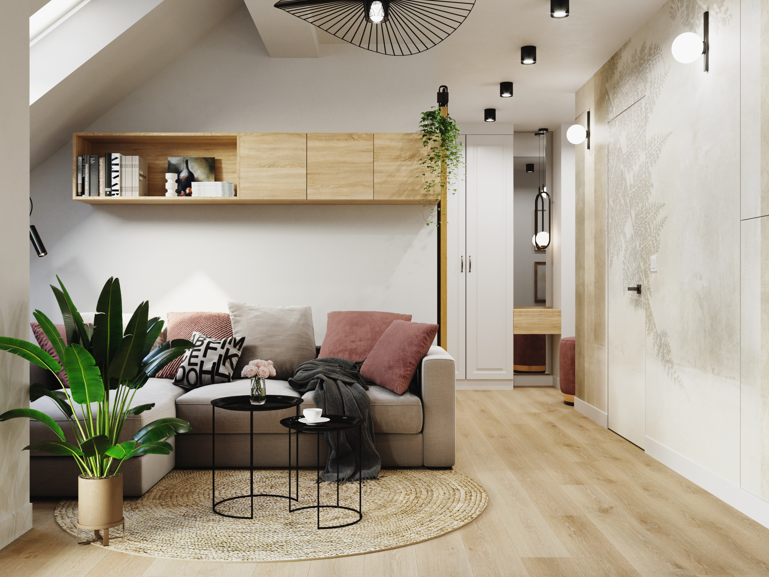 Ten projekt to małe poddasze, które tętni przytulnym, kobiecym charakterem i funkcjonalnością na najwyższym poziomie. Został stworzony z myślą o młodej inwestorce, która pragnęła przestrzeni zarazem przytulnej i wyrafinowanej — idealnej do życia tu i teraz.