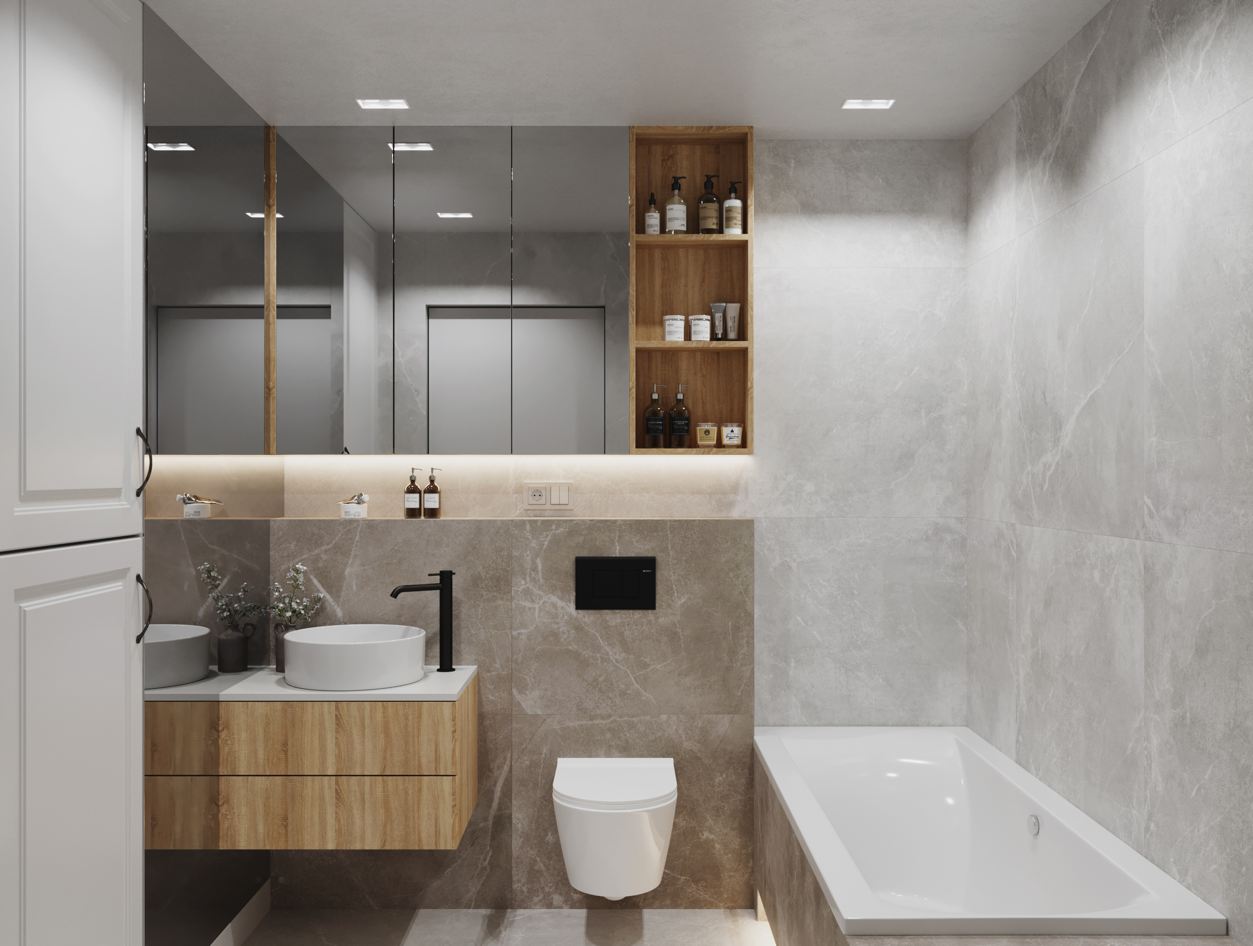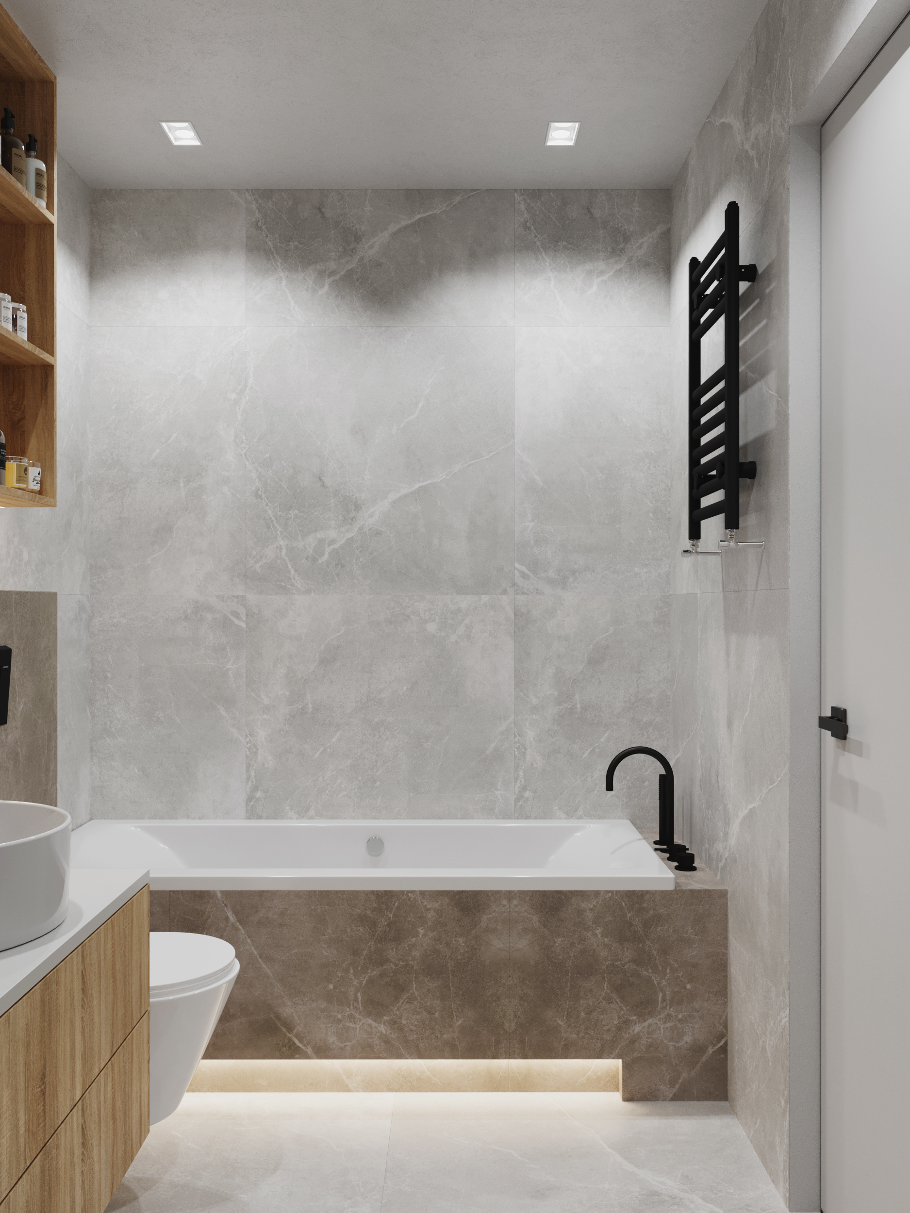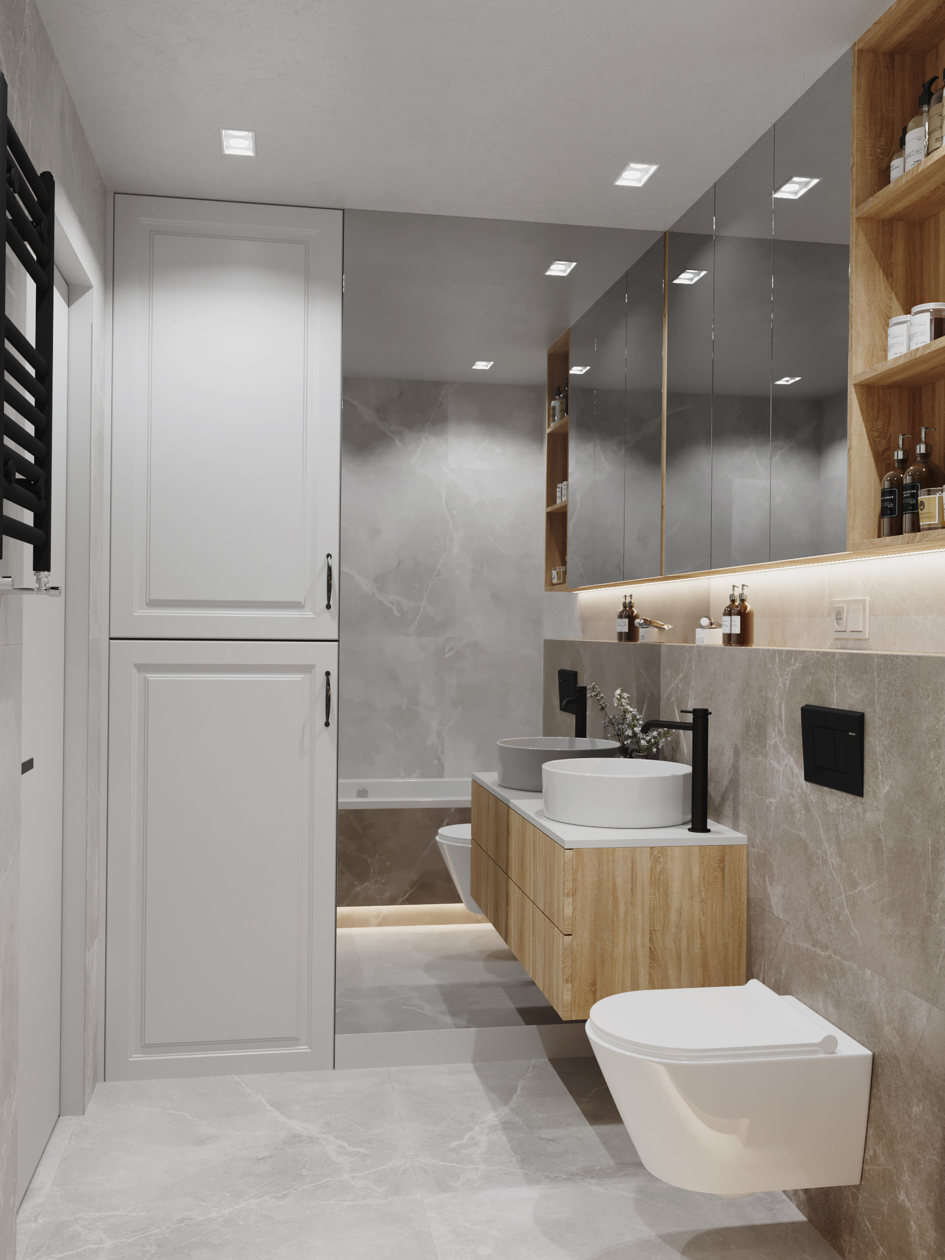 Łazienka została tak zaaranżowana, aby maksymalnie wykorzystać metraż: ergonomiczne rozmieszczenie sanitariatów, subtelne detale i stonowane barwy sprawiają, że codzienna rutyna zyskuje przyjemny, relaksujący charakter.