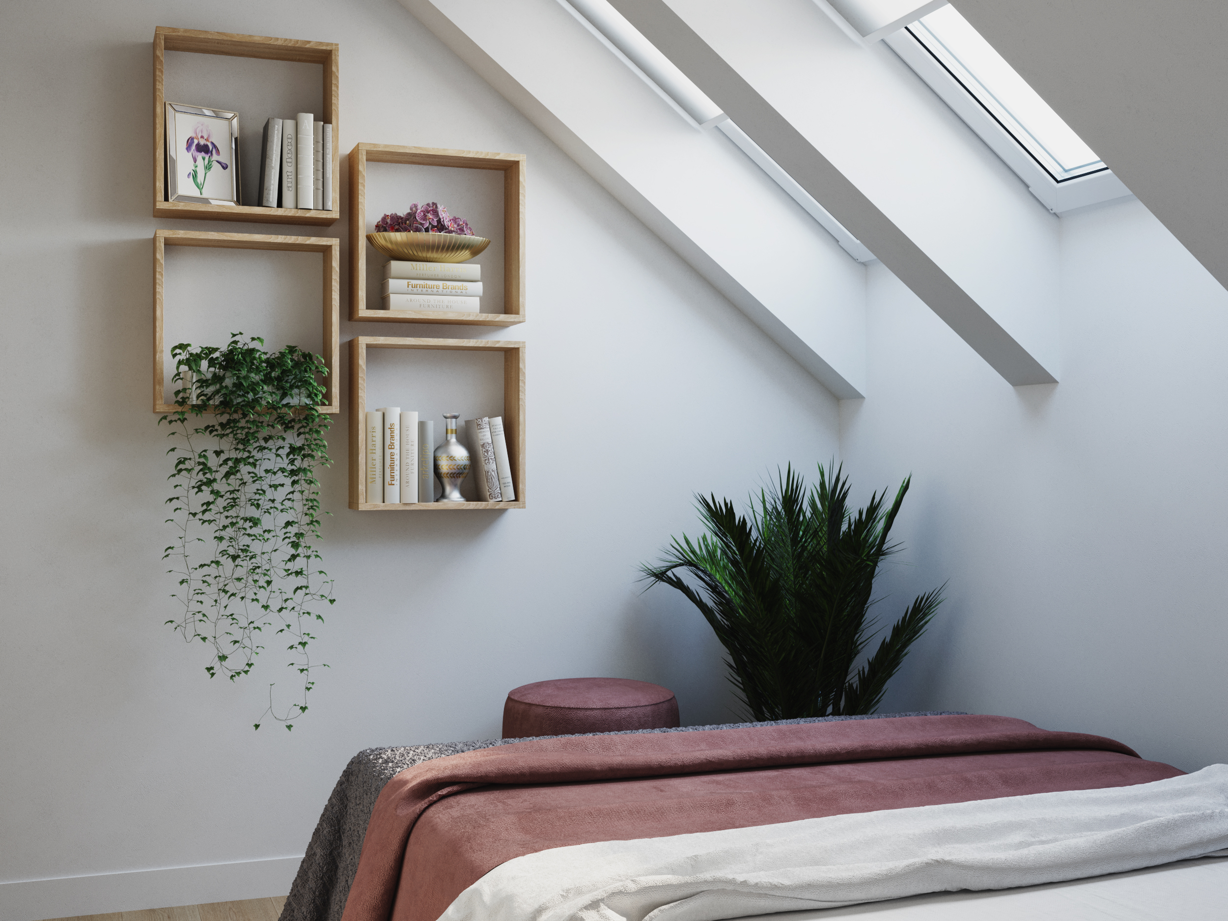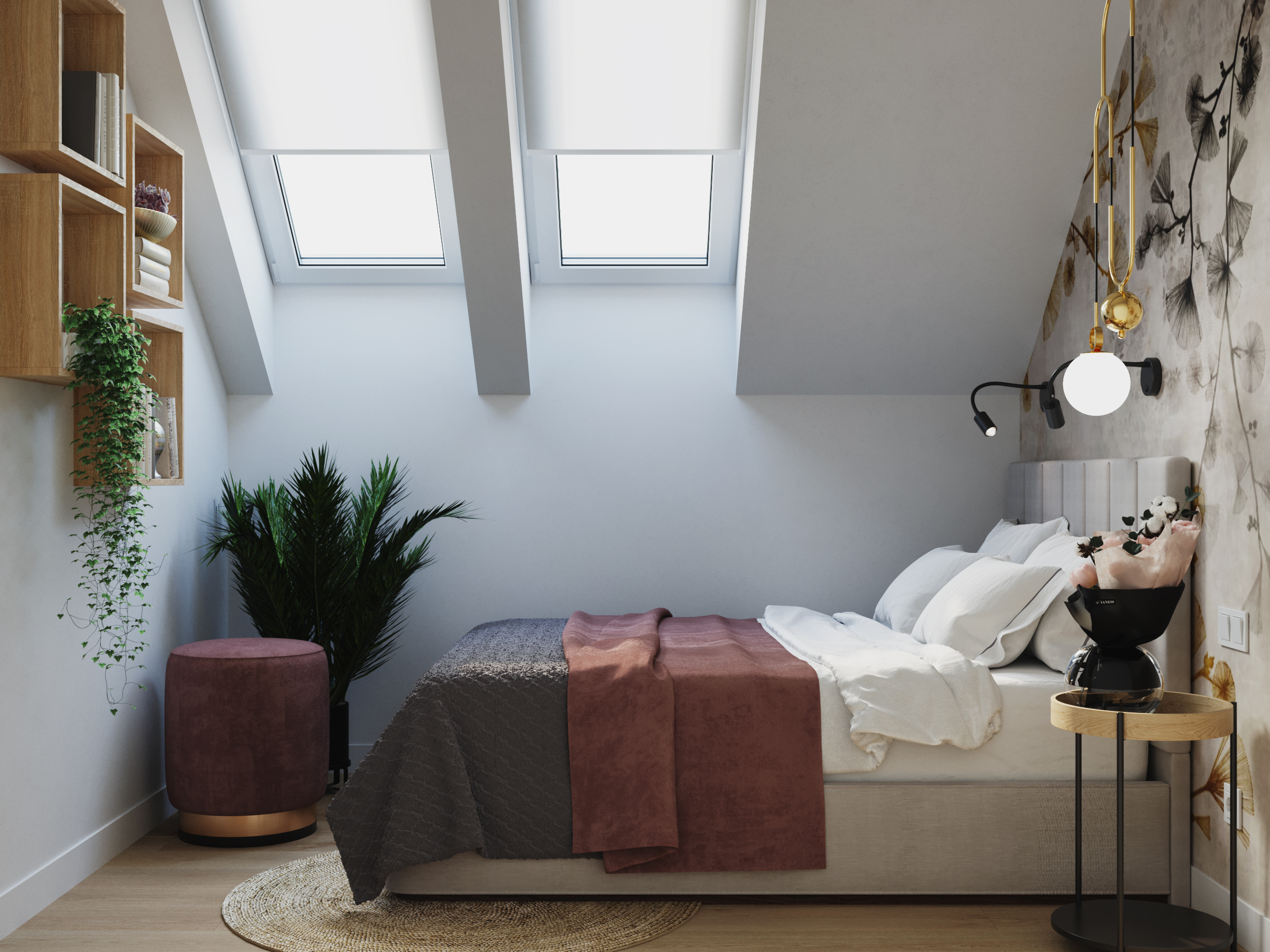 Przytulny salon połączony z kuchnią został zaprojektowany jako intymna, choć ekspresyjna przestrzeń. Skosy? Wykorzystane sprytnie — wraz z odpowiednim układem mebli i oświetlenia potęgują optyczne powiększenie wnętrza. Drewniane elementy i miękkie tkaniny budują przyjemną atmosferę do relaksu. Mała, ale komfortowa sypialnia to doskonałe miejsce do odpoczynku. Stonowana kolorystyka, naturalne materiały i przytulne tekstylia stwarzają poczucie schronienia po dniu pełnym wyzwań.
