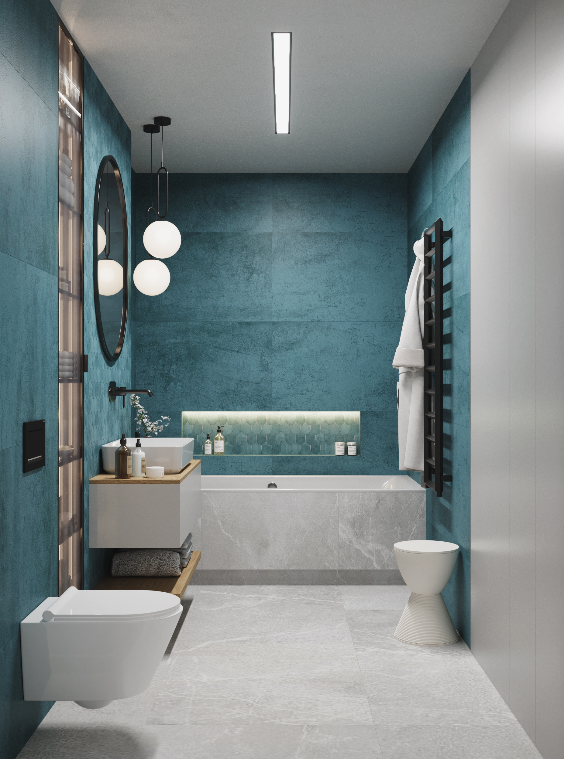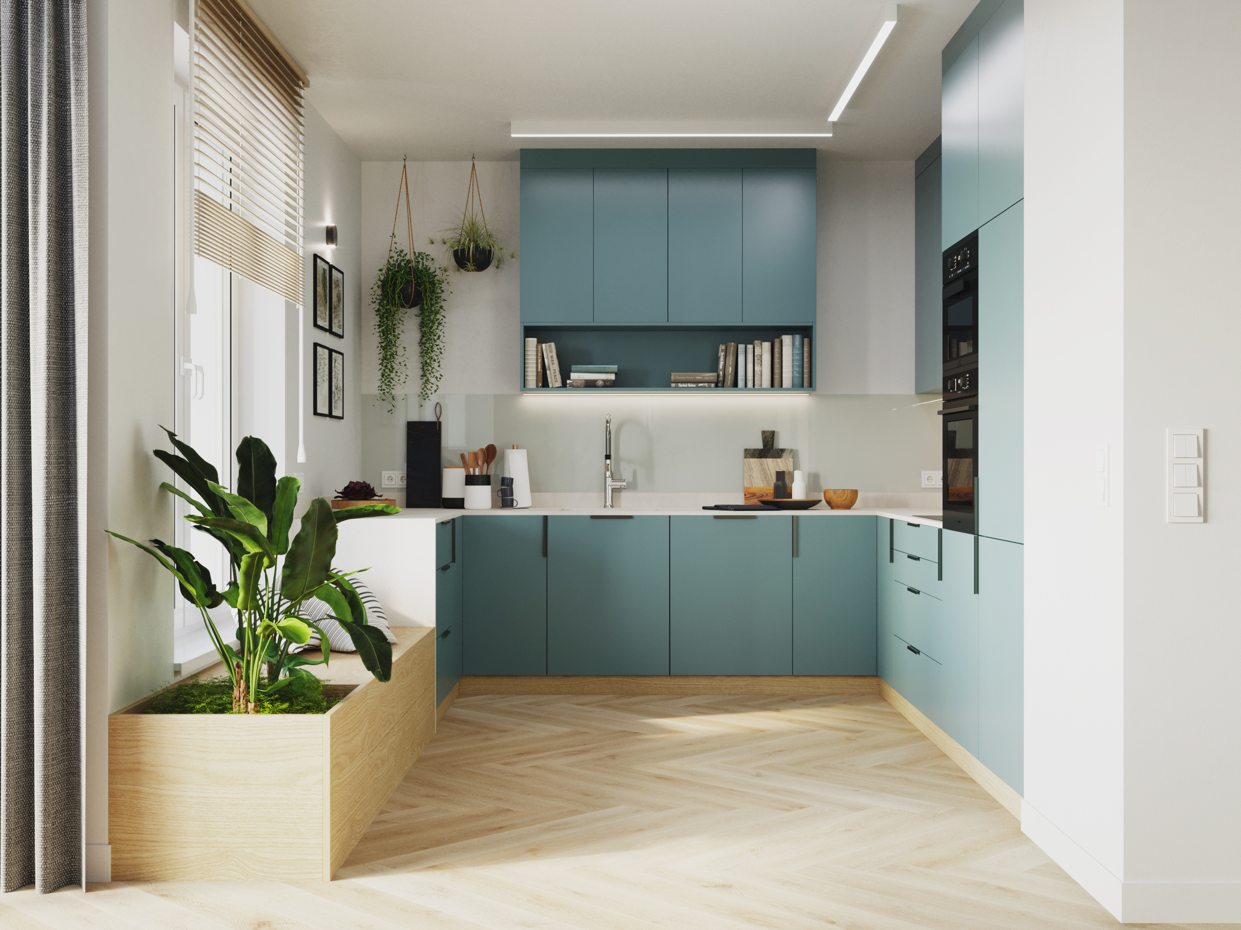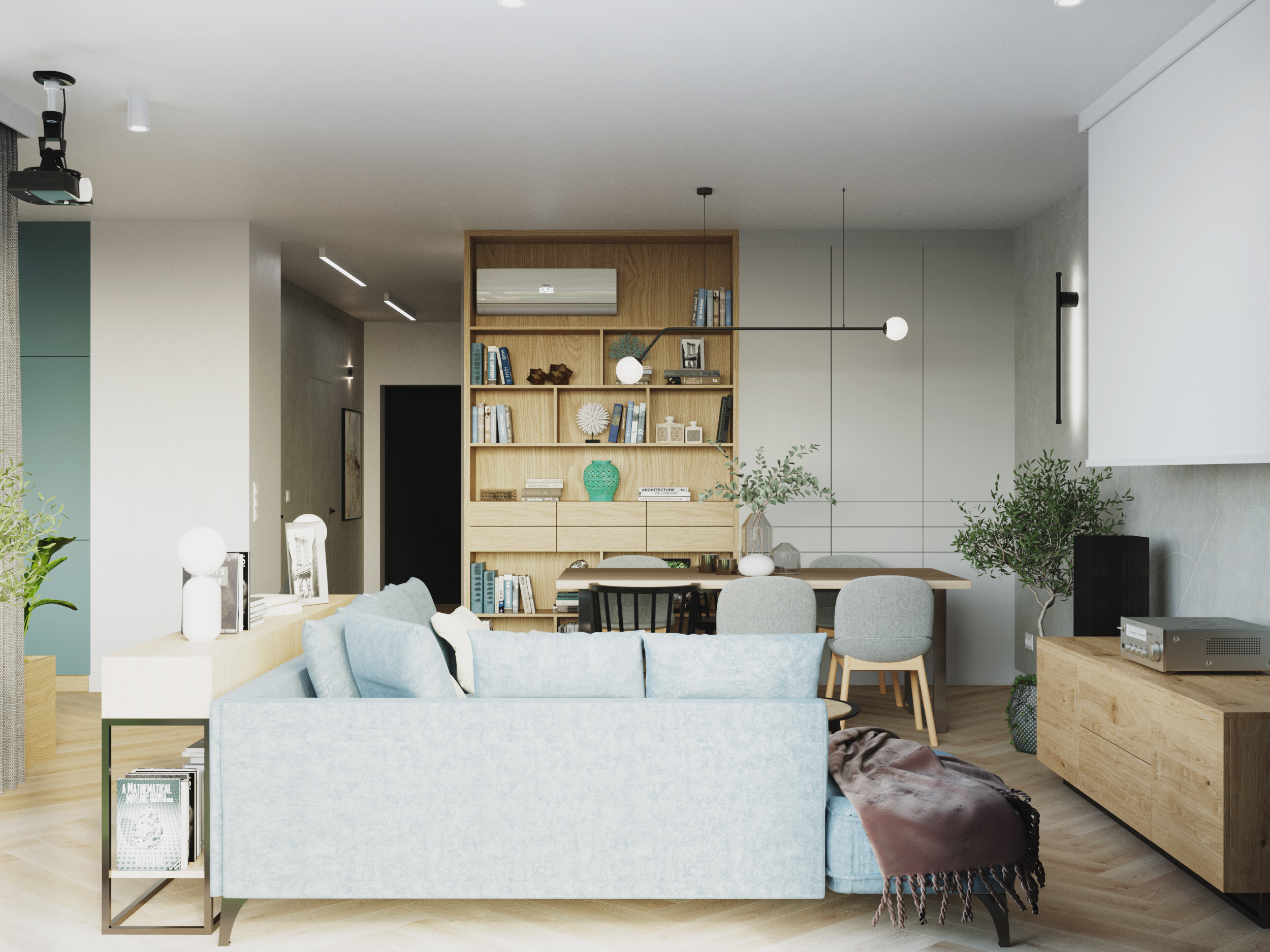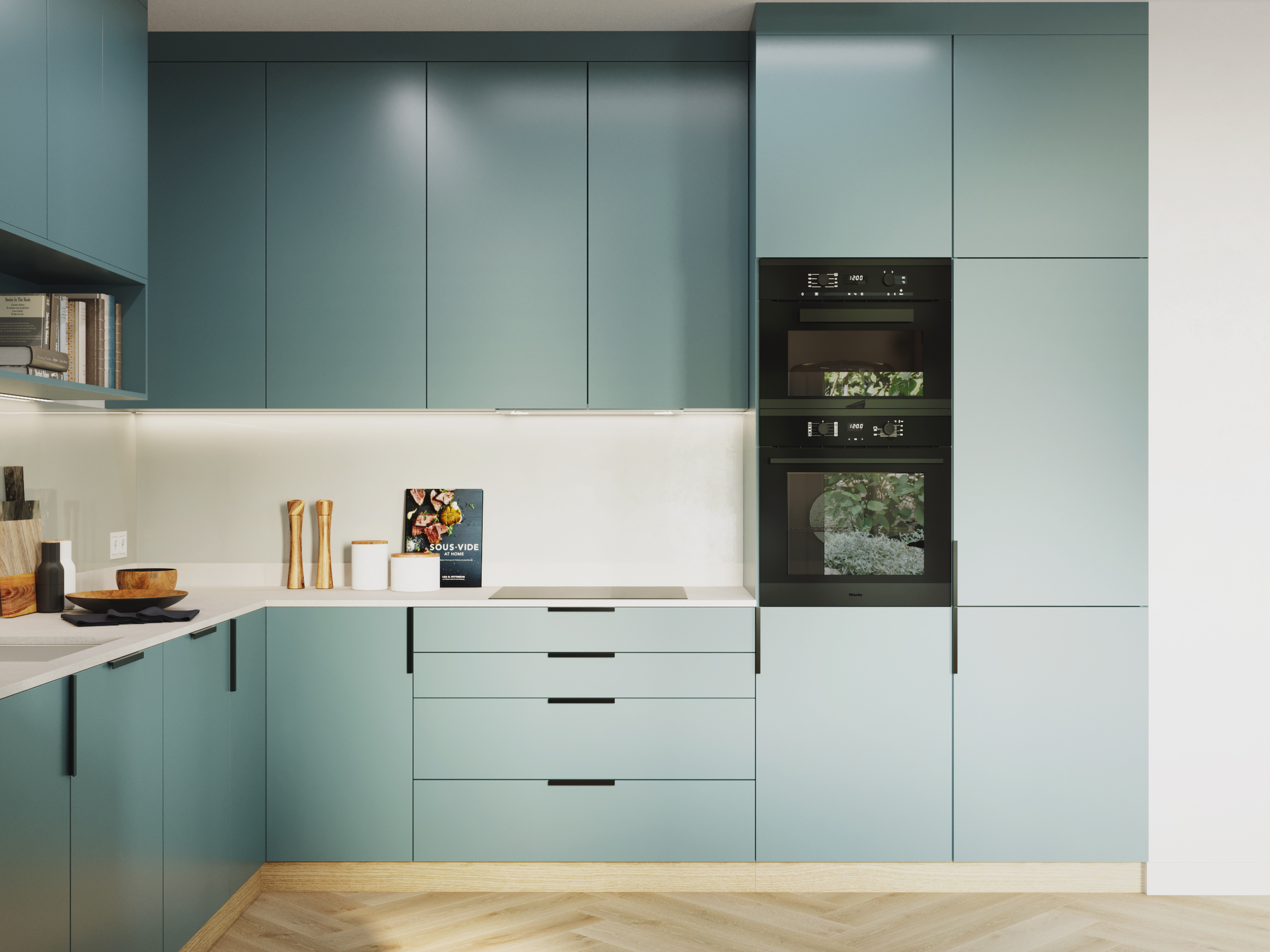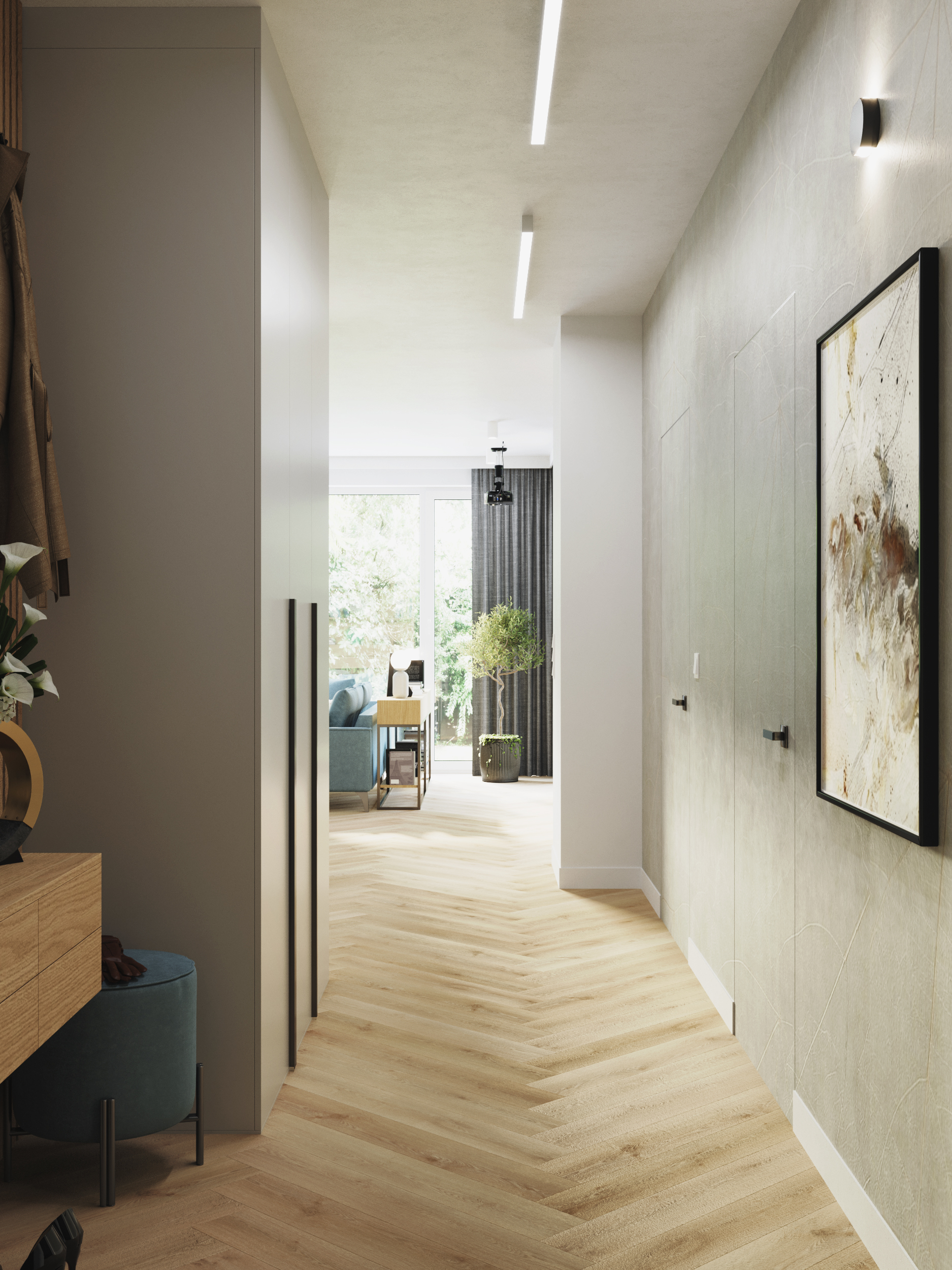 Całość aranżacji spina seledyn – ulubiony kolor właścicieli. Ten świeży i odważny akcent kolorystyczny przełamuje stonowaną bazę, dodając wnętrzu lekkości i charakteru. Dzięki temu mieszkanie zyskuje indywidualny styl, który doskonale oddaje osobowość inwestorów.