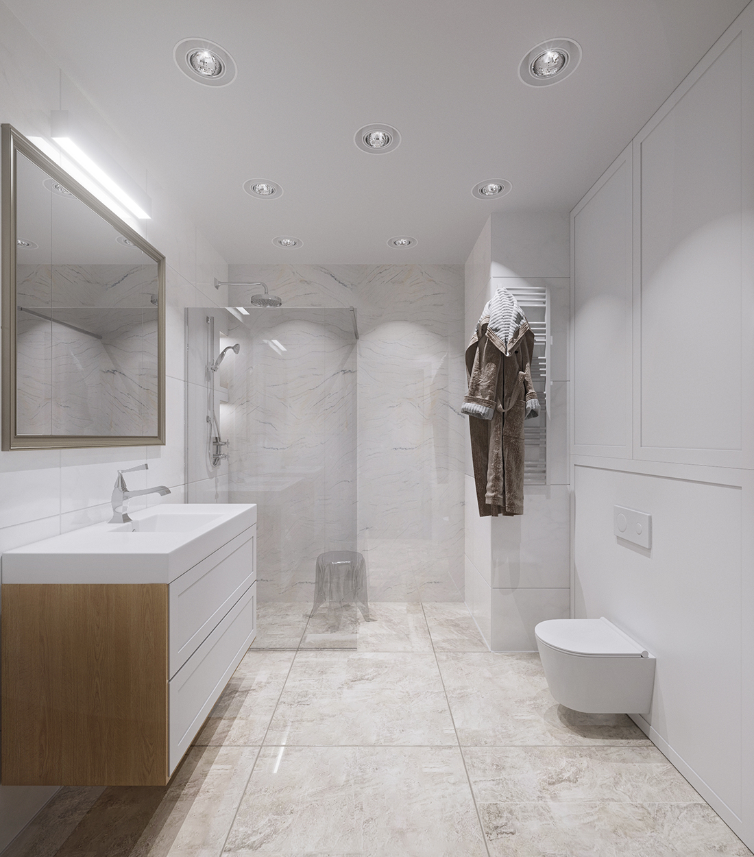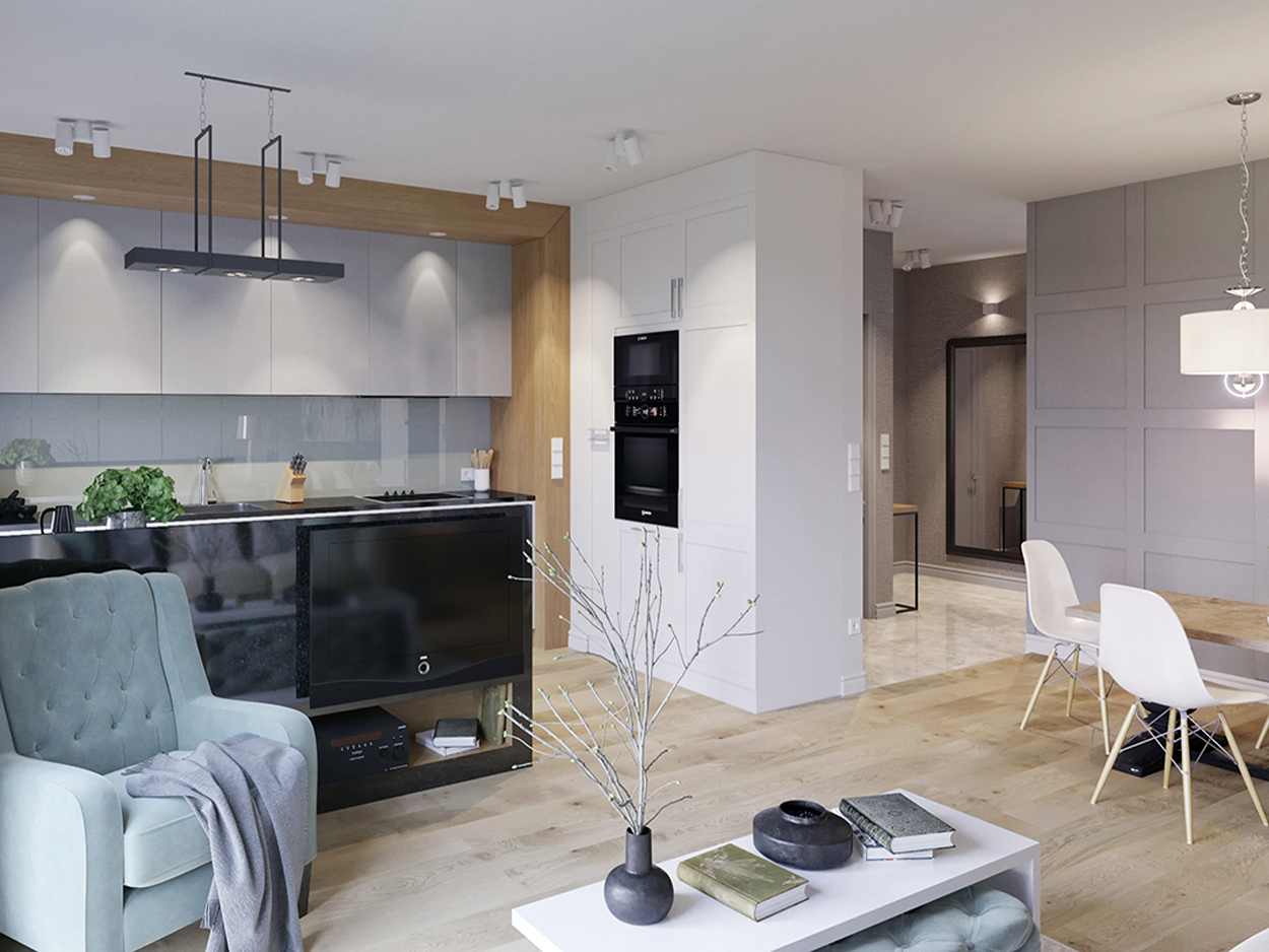 Całe mieszkanie zostało zaprojektowane z myślą o łatwym życiu wynajmującym — estetyka spotyka tu się z praktycznością. Materiały odporne na zużycie, spójna kolorystyka i harmonijny układ przestrzenny tworzą wnętrze, w którym chce się mieszkać od pierwszego dnia.